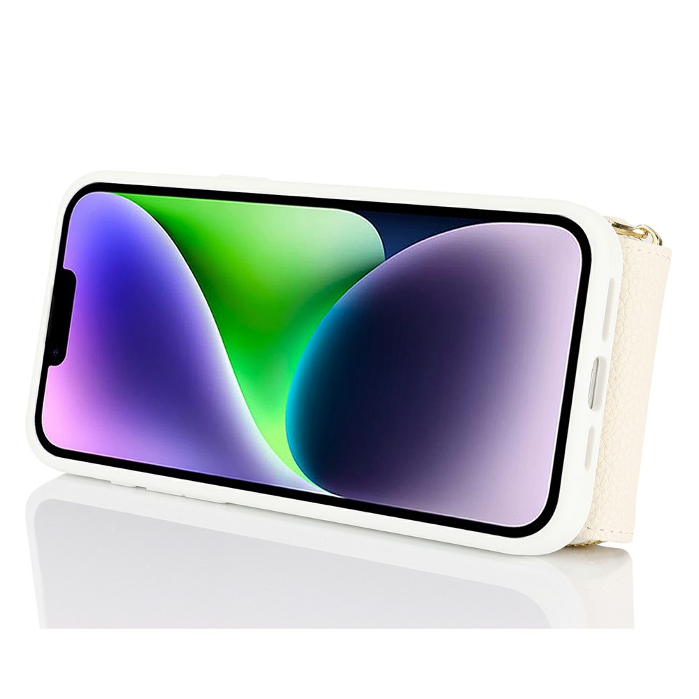 • For iPhone 15 Plus / 14 Plus Case with Zipper Pouch / Ring Kickstand / Strap Litchi Texture PU + TPU Phone Cover - Beige