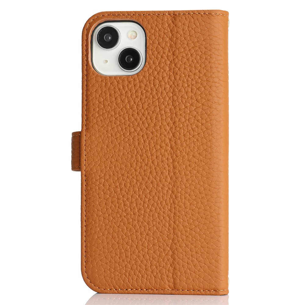 For iPhone 15 Plus  /  14 Plus Stand Case Litchi Texture Genuine Cow Leather Wallet Phone Cover RFID Blocking - Dark Yellow