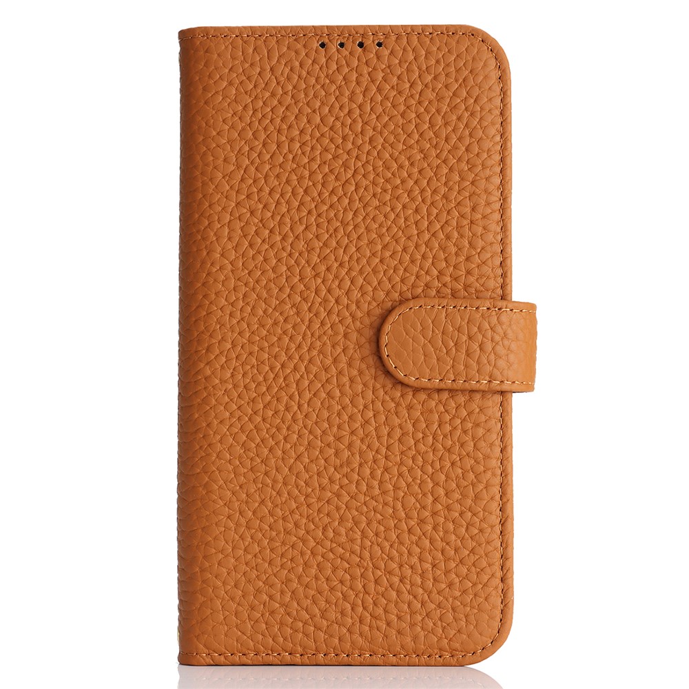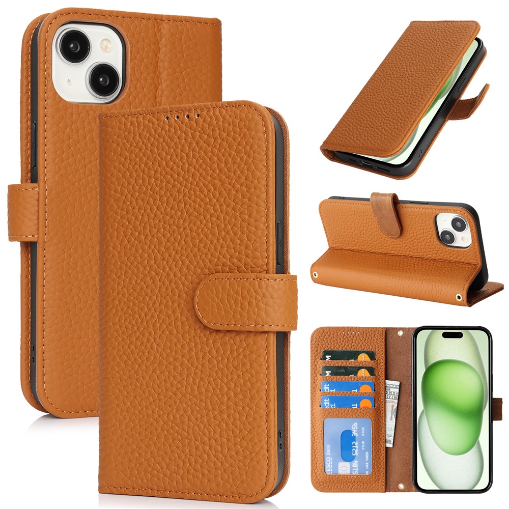 For iPhone 15 Plus / 14 Plus Stand Case Litchi Texture Genuine Cow Leather Wallet Phone Cover RFID Blocking - Dark Yellow $23.92