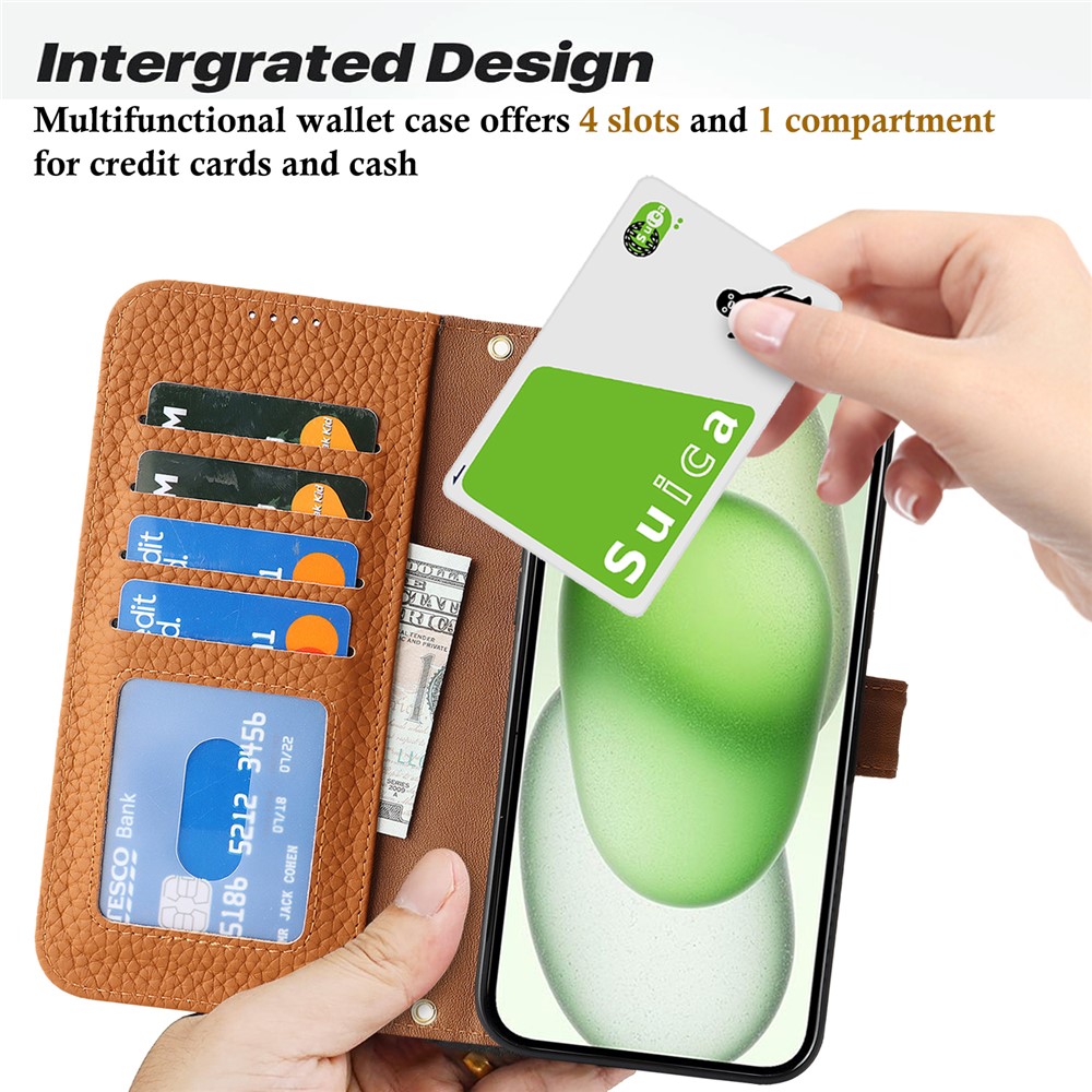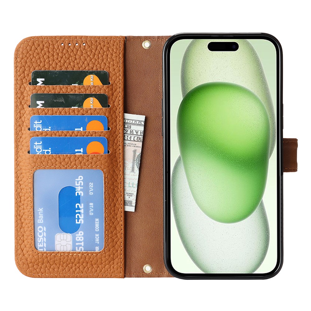 • For iPhone 15 Plus  /  14 Plus Stand Case Litchi Texture Genuine Cow Leather Wallet Phone Cover RFID Blocking - Black