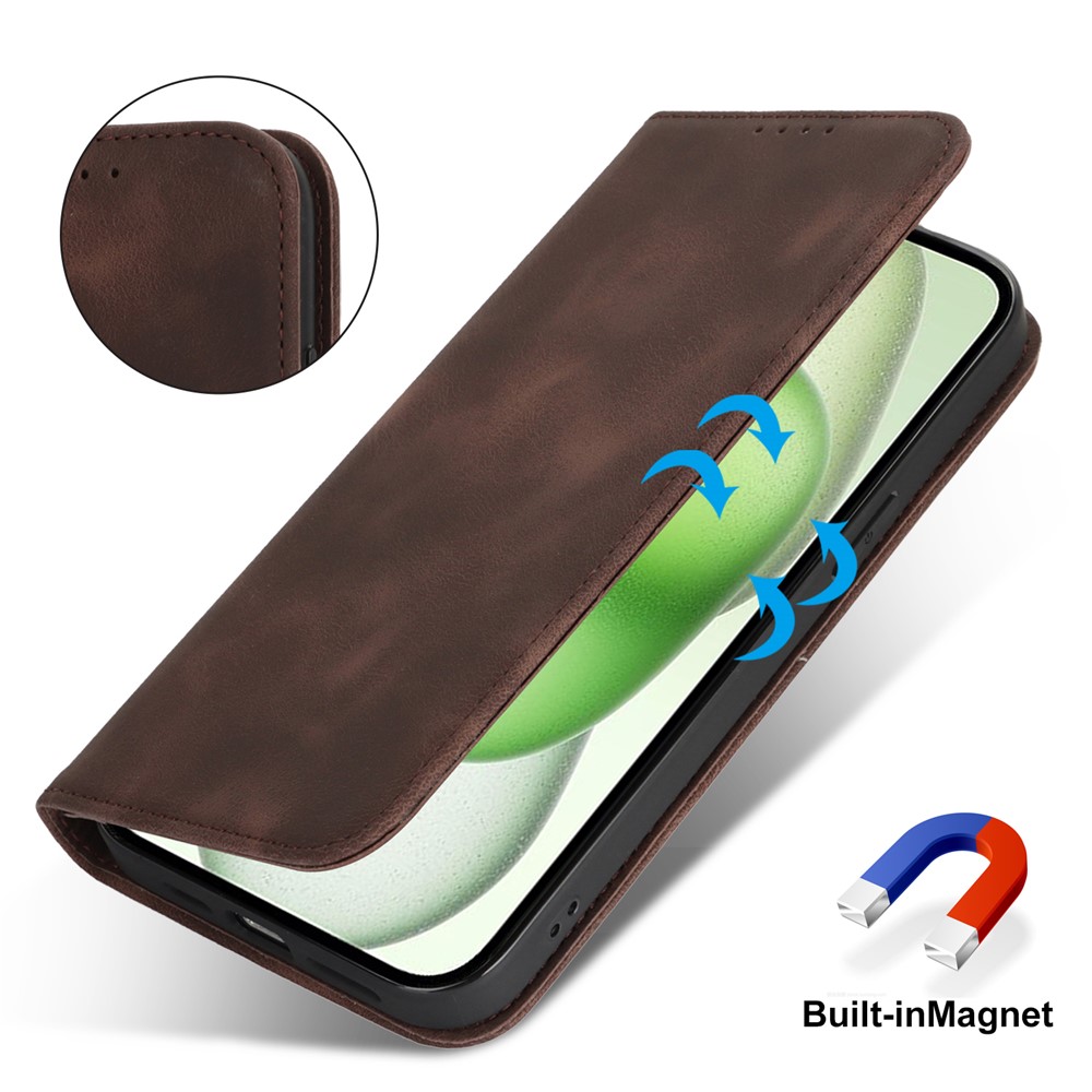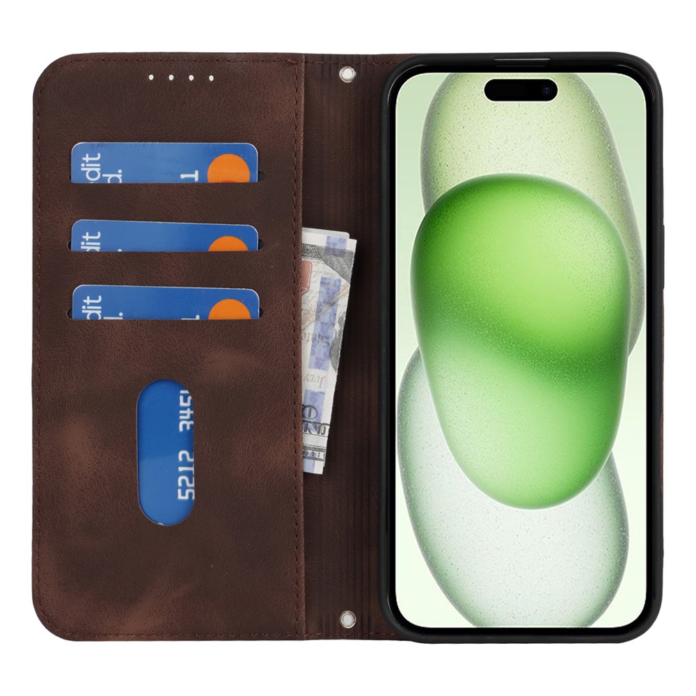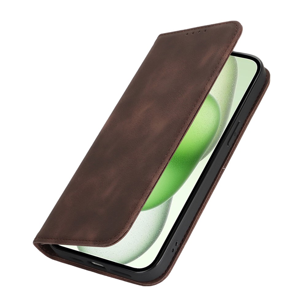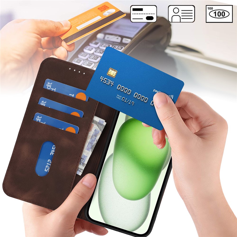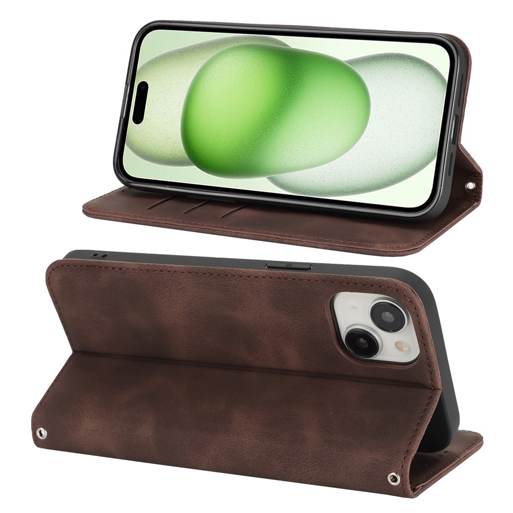 • For iPhone 15 Plus  /  14 Plus Stand Case Magnetic Closure Skin Touch Leather Flip Phone Cover with Wallet - Brown