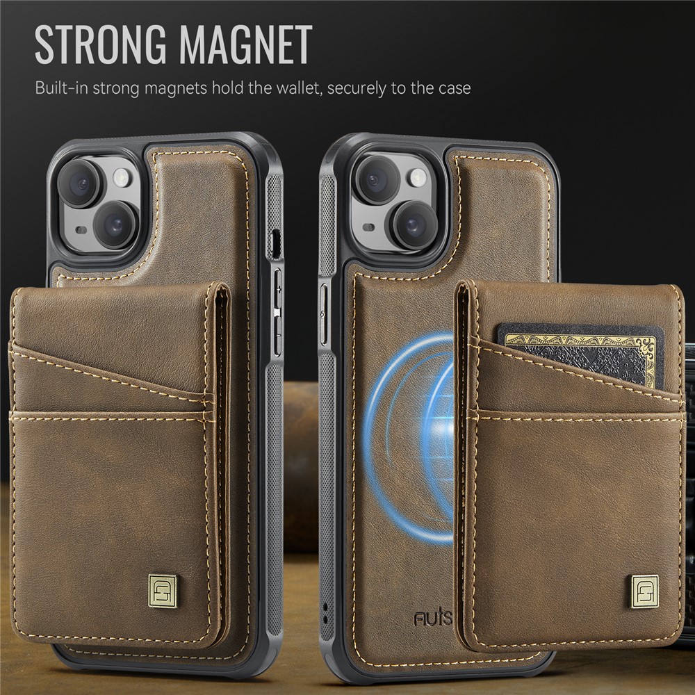 For iPhone 15 Plus Case AUTSPACE A12 Leather Phone Case with Detachable Card Bag – Coffee