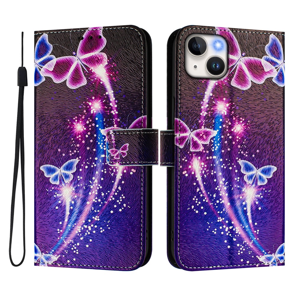 For iPhone 15 Plus Case Pattern Printing Wallet Phone Cover with Strap – Firework Butterfly
