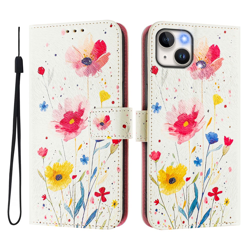 For iPhone 15 Plus Case Pattern Printing Wallet Phone Cover with Strap – Flower