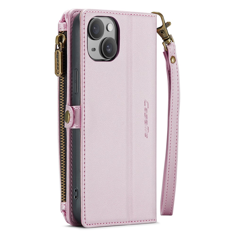 For iPhone 15 Plus Leather Case CASEME C36 Zipper Multiple Card Slots Phone Cover with Straps – Pink