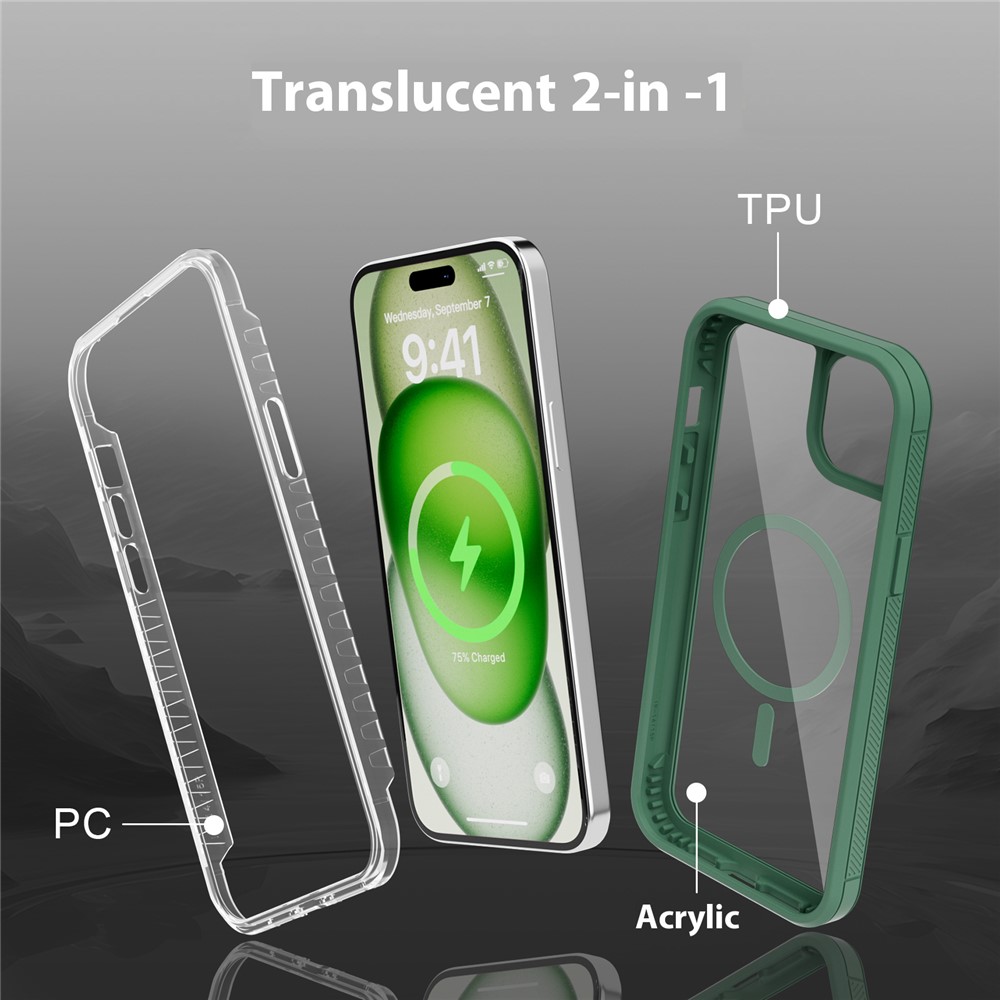 For iPhone 15 Plus Magnetic Case Translucent Detachable 2 in 1 TPU + PC Shockproof Phone Cover – Green