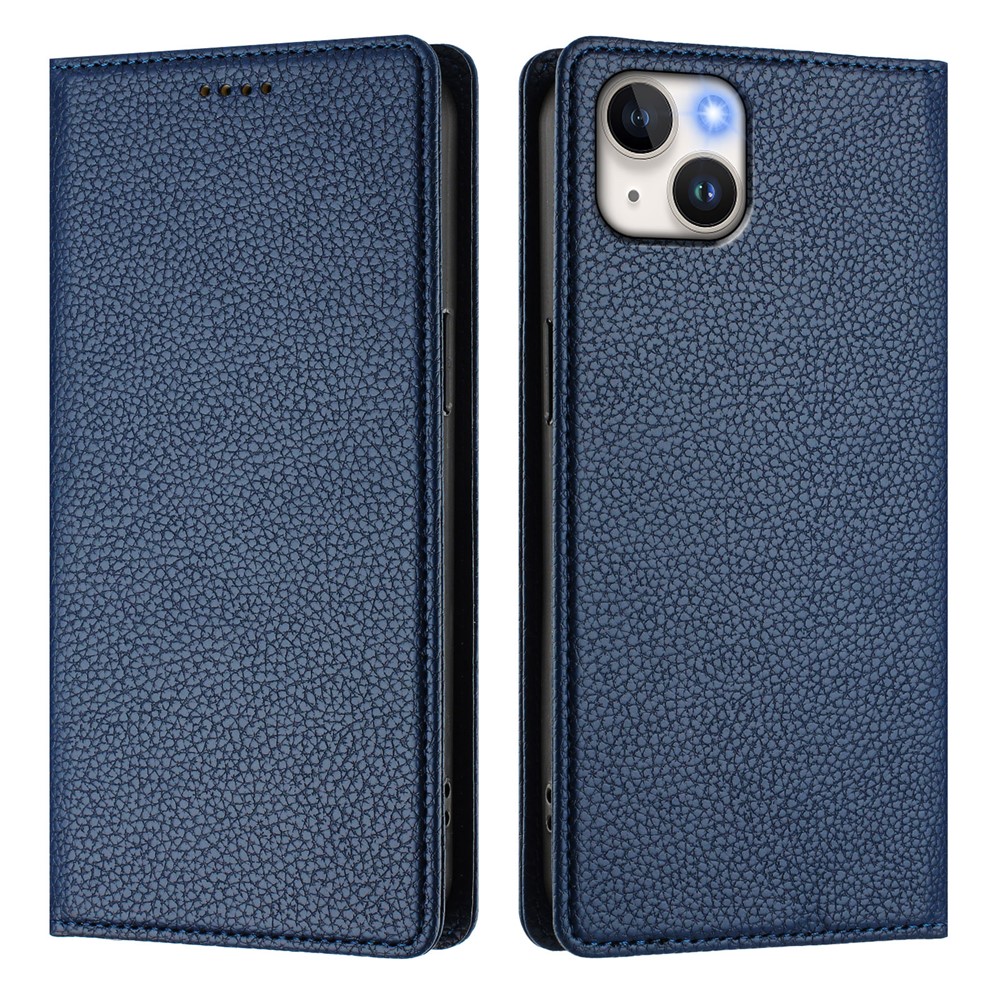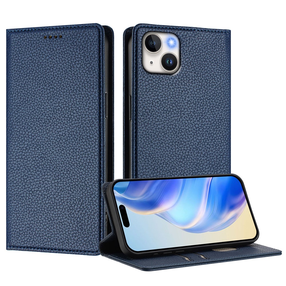 For iPhone 15 Plus Wallet Case RFID Blocking Litchi Texture Leather Mobile Cover – Dark Blue