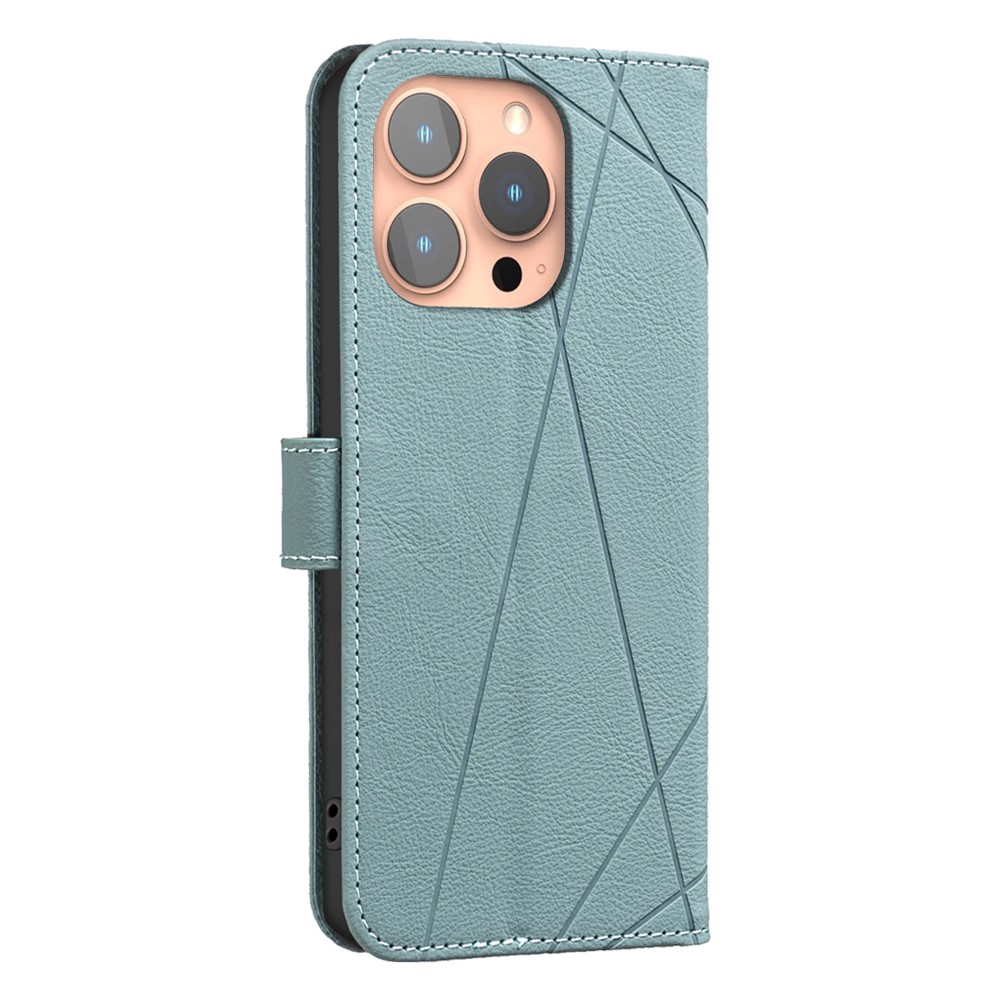 For iPhone 15 Pro Case BINFEN COLOR BF35 Geometry Imprinted Leather Phone Cover RFID Blocking Wallet Stand - Green