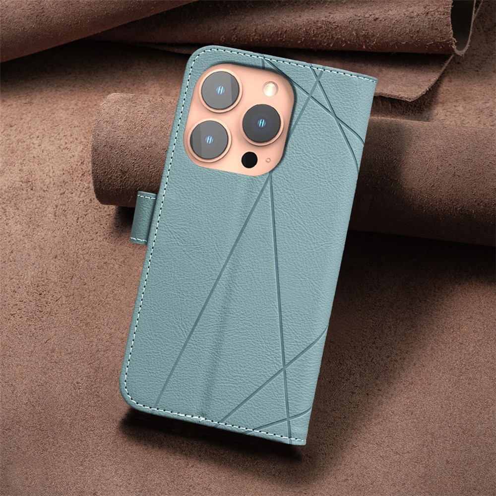 For iPhone 15 Pro Case BINFEN COLOR BF35 Geometry Imprinted Leather Phone Cover RFID Blocking Wallet Stand - Green $15.72