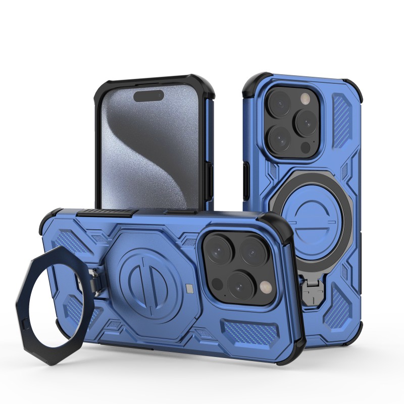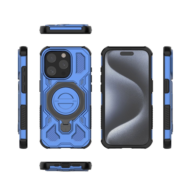 For iPhone 15 Pro Case Kickstand with 2Pcs Screen Film WANLONFENG KJ Series PC TPU Phone Cover (Big Lens Hole) - Blue $16.95