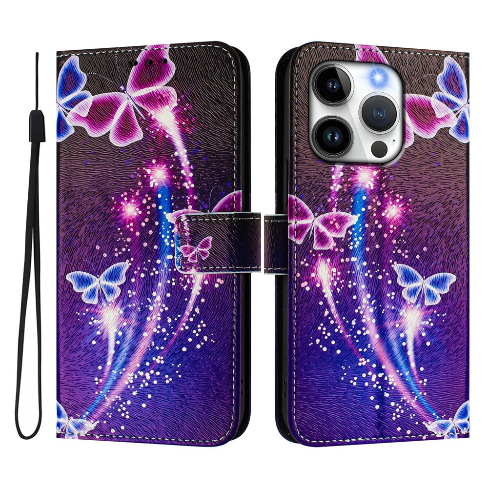For iPhone 15 Pro Case Pattern Printing Wallet Phone Cover with Strap – Firework Butterfly