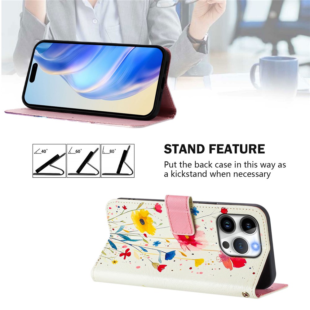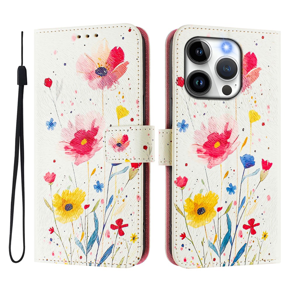 For iPhone 15 Pro Case Pattern Printing Wallet Phone Cover with Strap – Flower