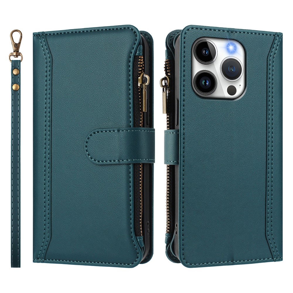 For iPhone 15 Pro Leather Case 9 Card Slots Zipper Wallet Stand Phone Cover with Wrist Strap - Dark Green $18.27