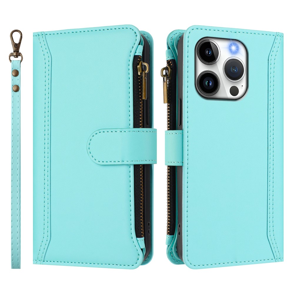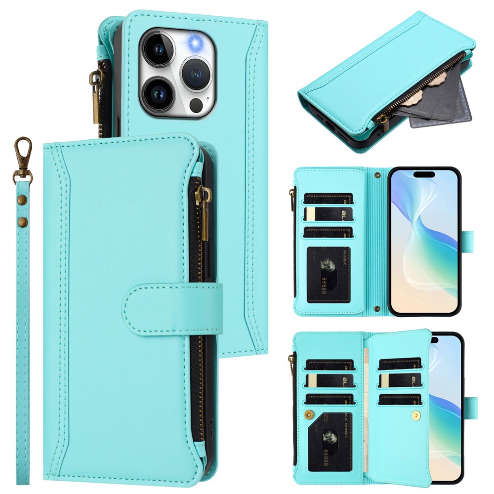 For iPhone 15 Pro Leather Case 9 Card Slots Zipper Wallet Stand Phone Cover with Wrist Strap – Mint Green