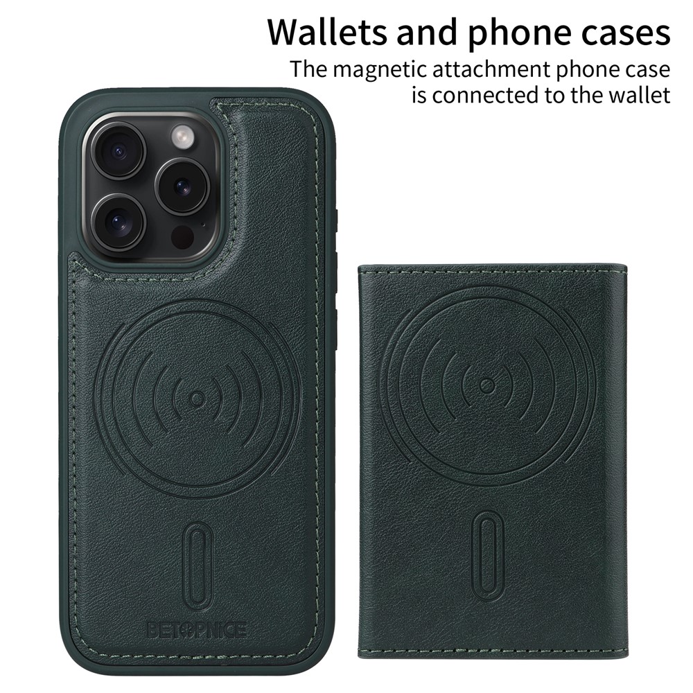 For iPhone 15 Pro Magnetic Case BETOPNICE Leather Phone Cover Kickstand with Detachable Card Bag - Green