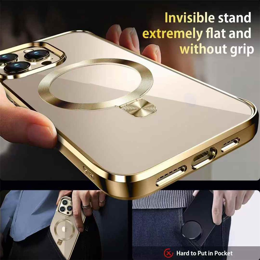 • For iPhone 15 Pro Magnetic Case Electroplated TPU + PC Kickstand Clear Back Phone Cover - Gold