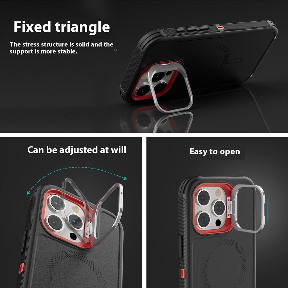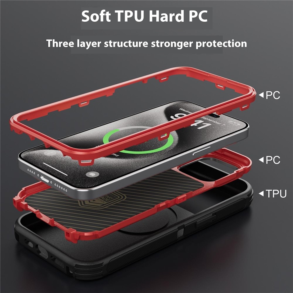 For iPhone 15 Pro Magnetic Case Lens Kickstand 3 in 1 Detachable TPU + PC Phone Back Cover with Lanyard - Black / Red $18.88