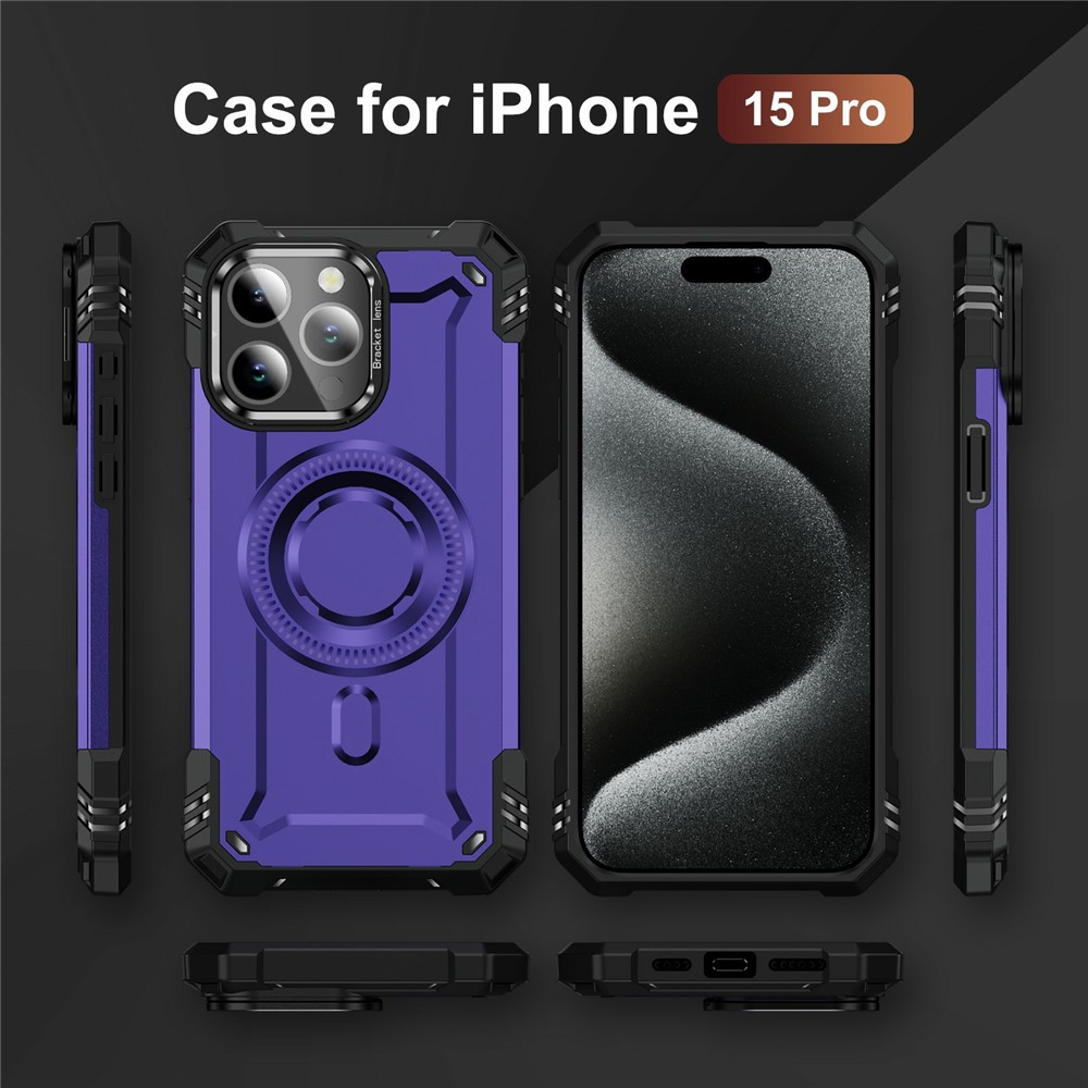 For iPhone 15 Pro Magnetic Case Lens Kickstand PC + TPU Shockproof Phone Cover - Purple $18.35