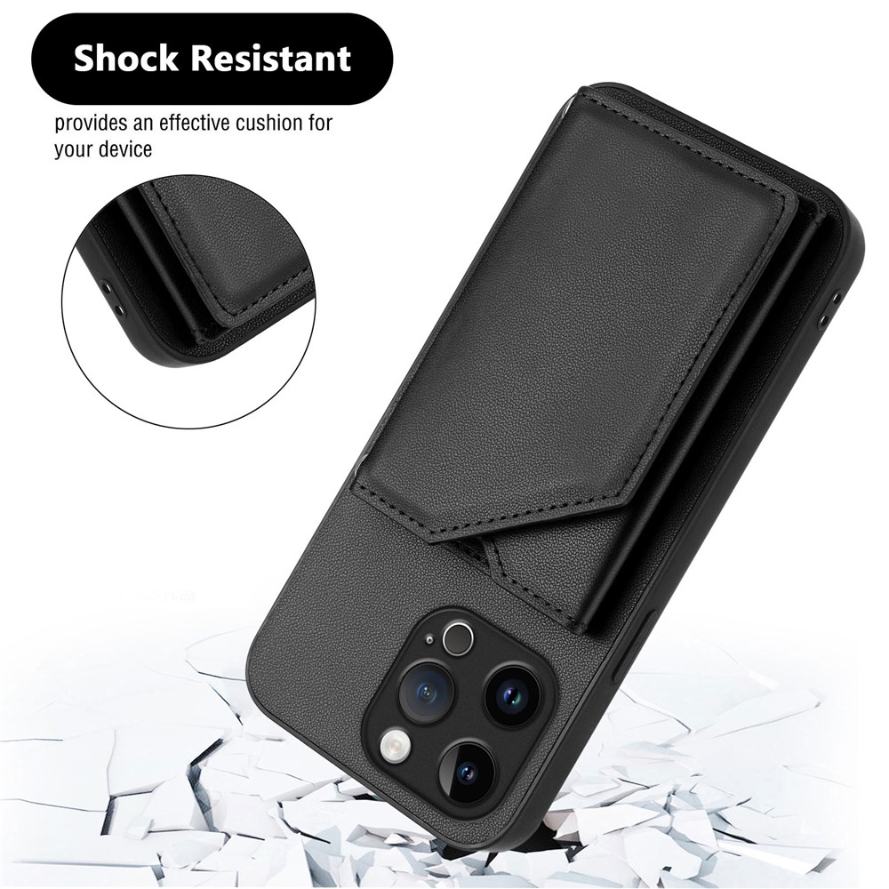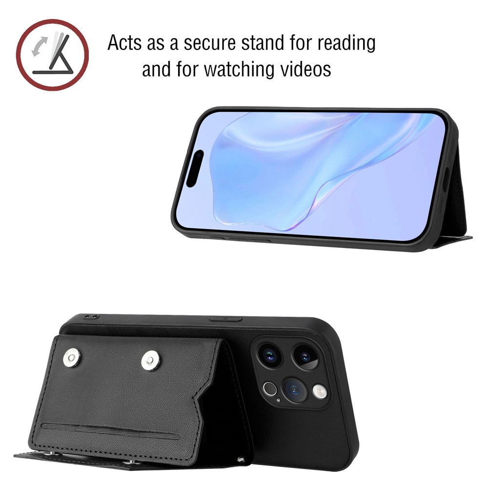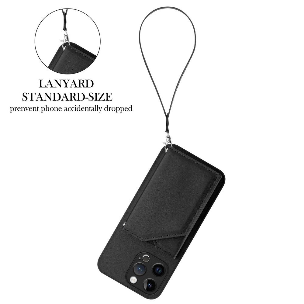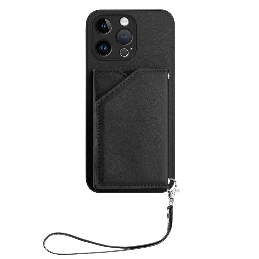 For iPhone 15 Pro Max Case Card Holder Kickstand Skin-Touch Phone Cover with Wrist Strap – Black