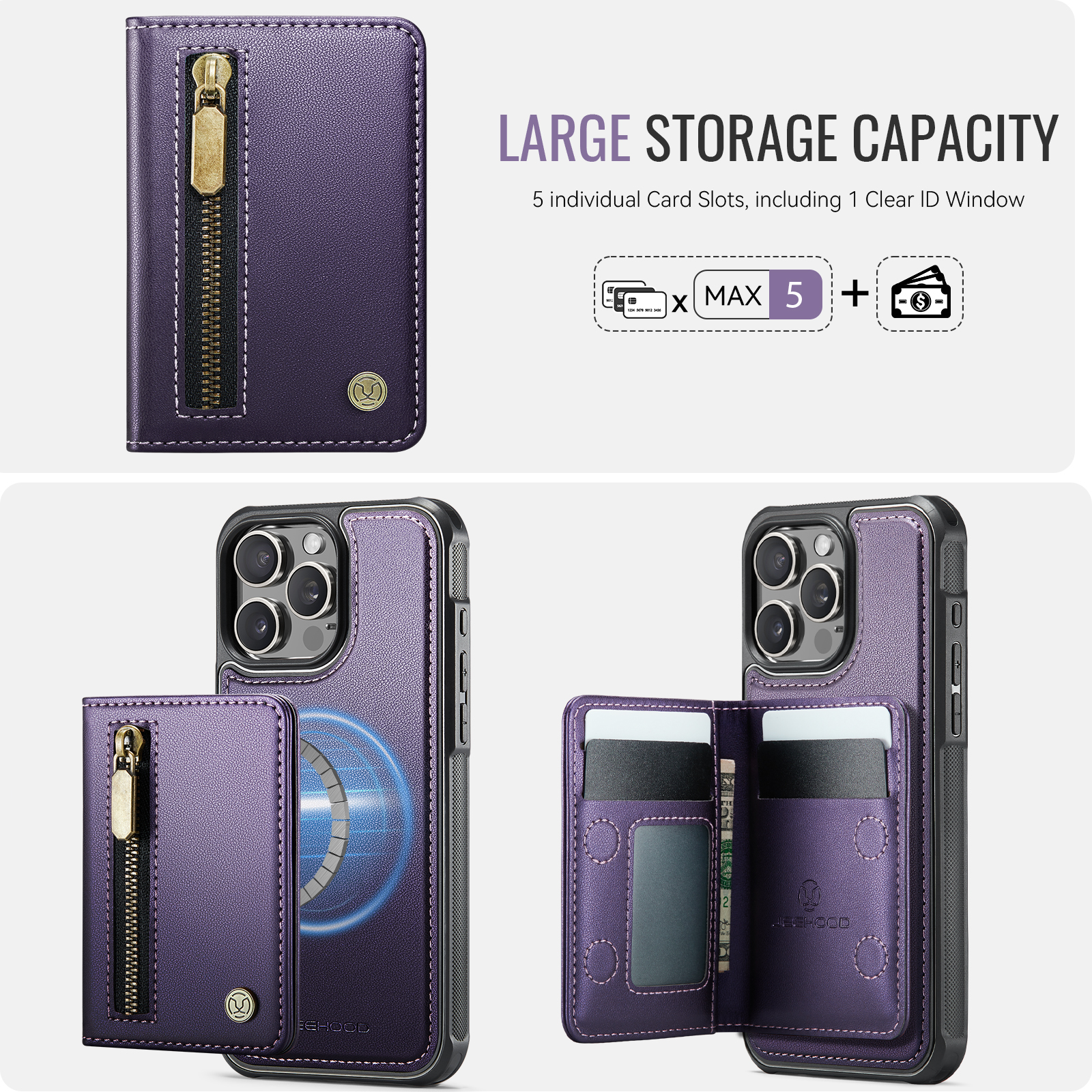 - Versatile Storage Features 1 zipper pocket on the front, 1 photo slot, 3 card slots, and a cash slot inside for maximum organization.