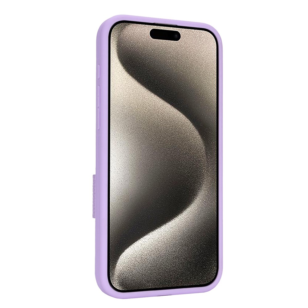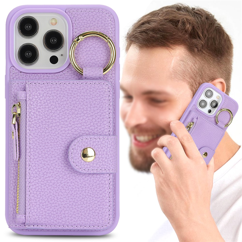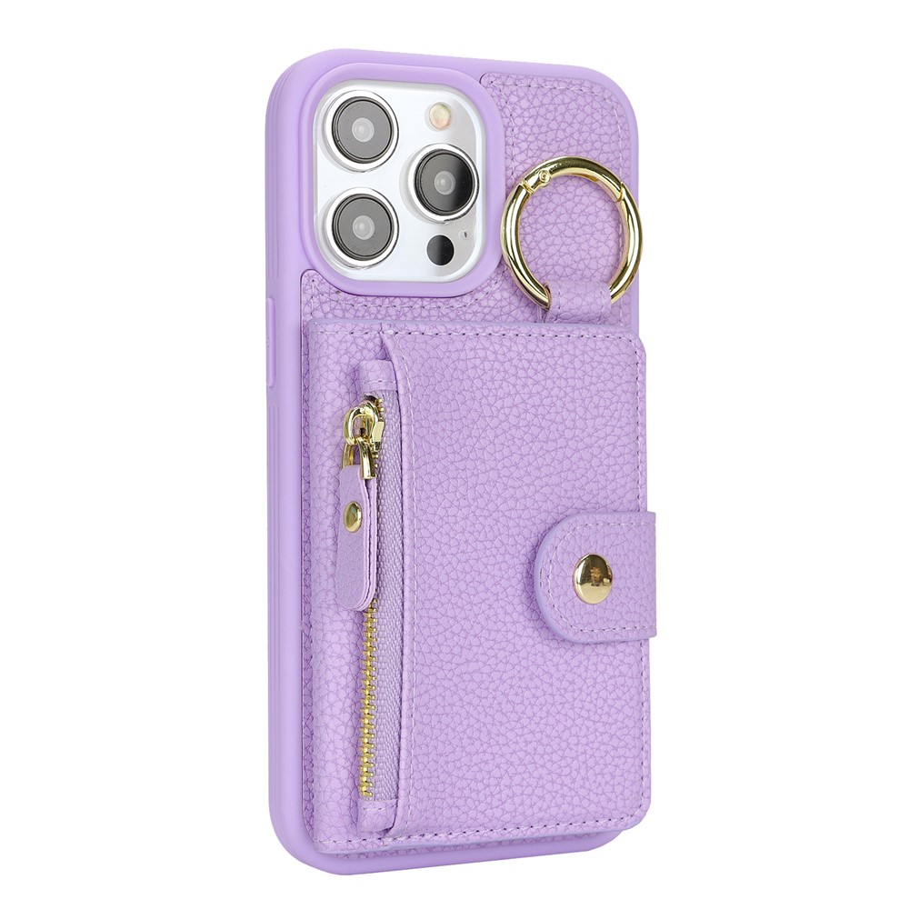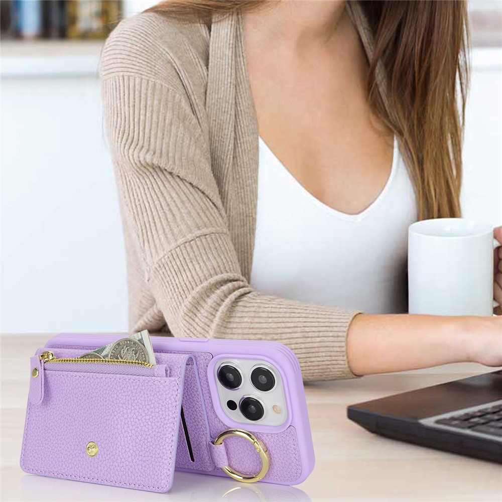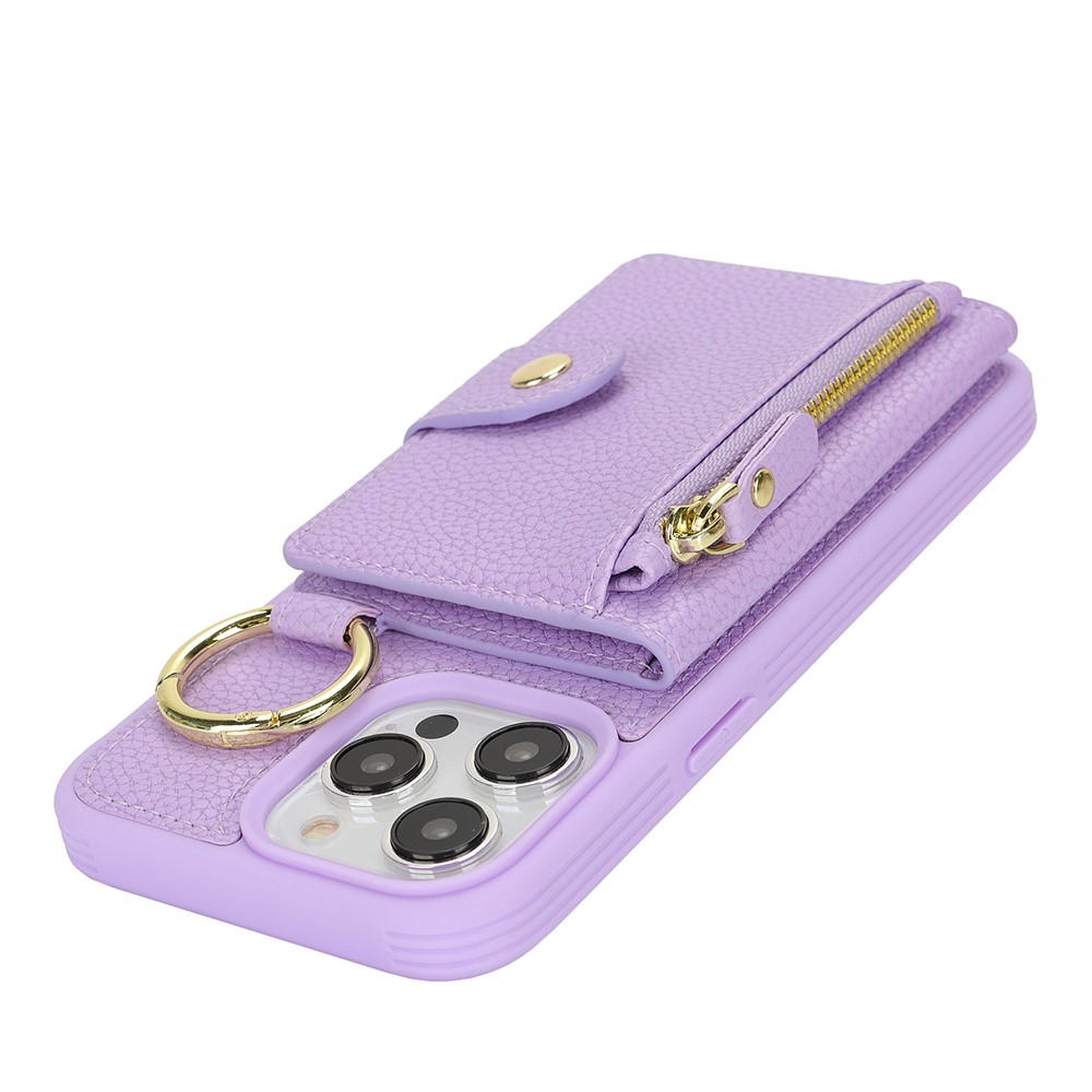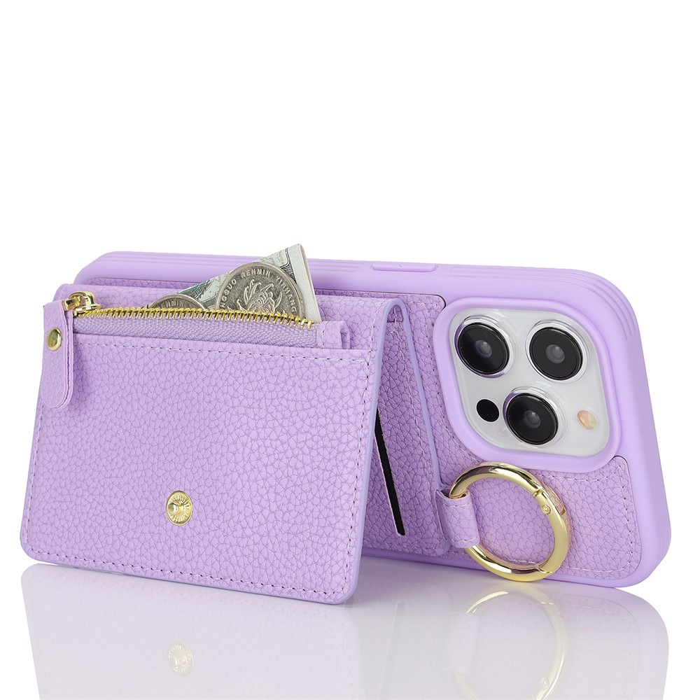For iPhone 15 Pro Max Case Litchi Textured PU Leather + TPU Kickstand Phone Cover with Card Slot – Purple