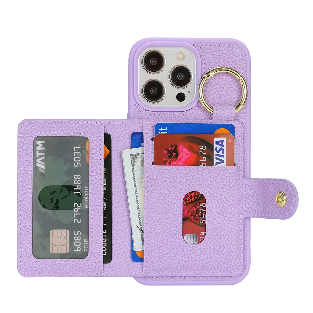 For iPhone 15 Pro Max Case Litchi Textured PU Leather + TPU Kickstand Phone Cover with Card Slot - Purple