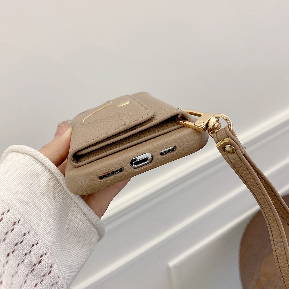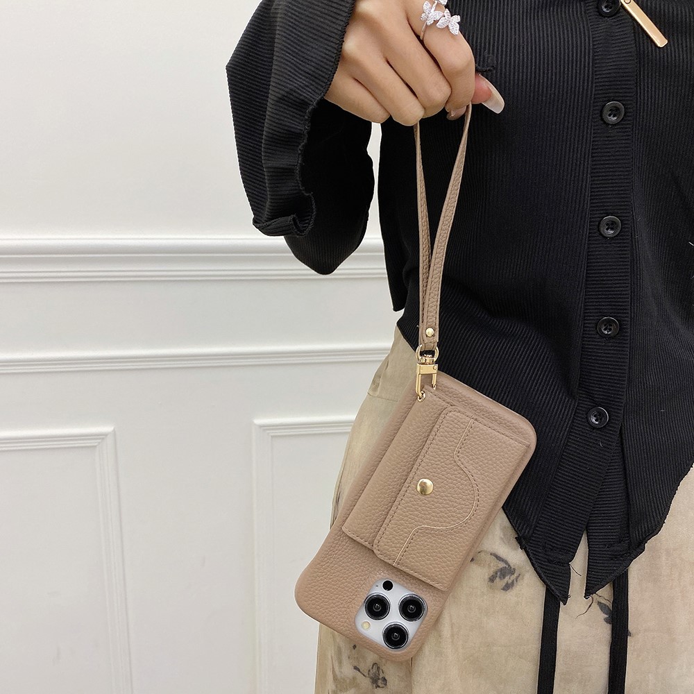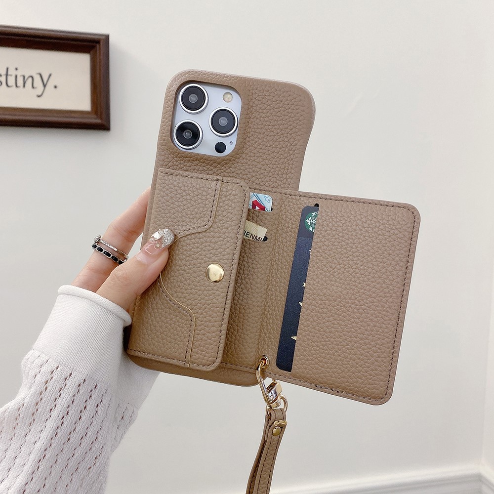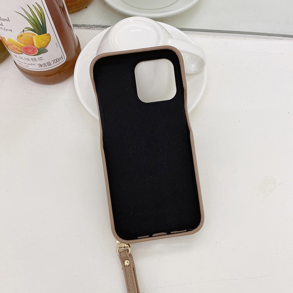 For iPhone 15 Pro Max Case Mirror Design PU Leather Back Cover with Card Slots, Wrist Strap - Light Brown $20.22