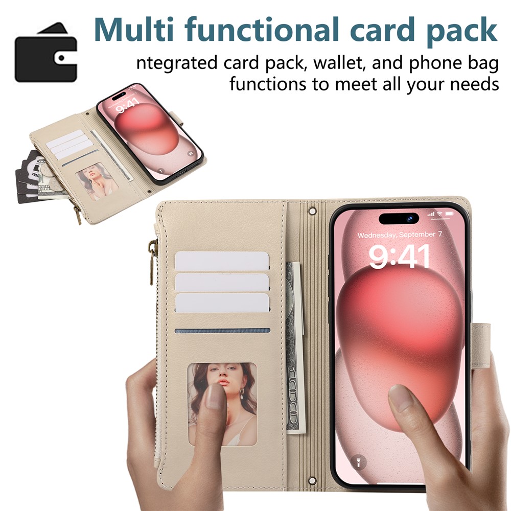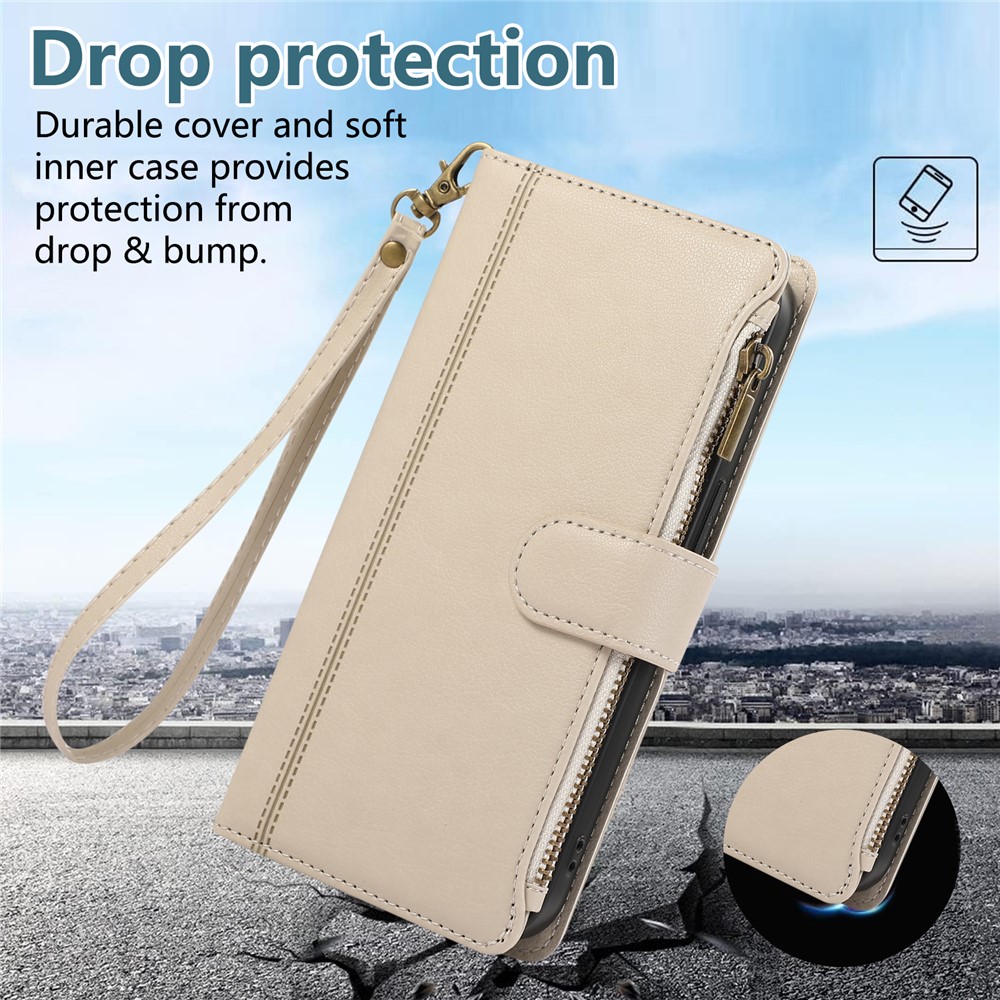 For iPhone 15 Pro Max Case Multi Card Slots Zipper Leather Phone Cover with Wrist Strap - Beige $17.75