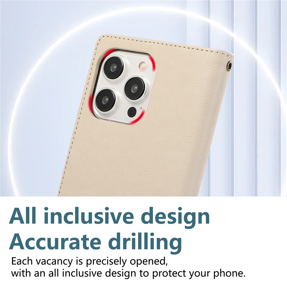 For iPhone 15 Pro Max Case Multi Card Slots Zipper Leather Phone Cover with Wrist Strap – Beige
