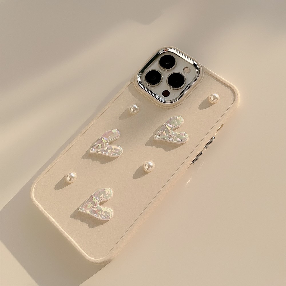 For iPhone 15 Pro Max Case Pearl Heart Aesthetic Shockproof TPU Phone Cover – Beige
