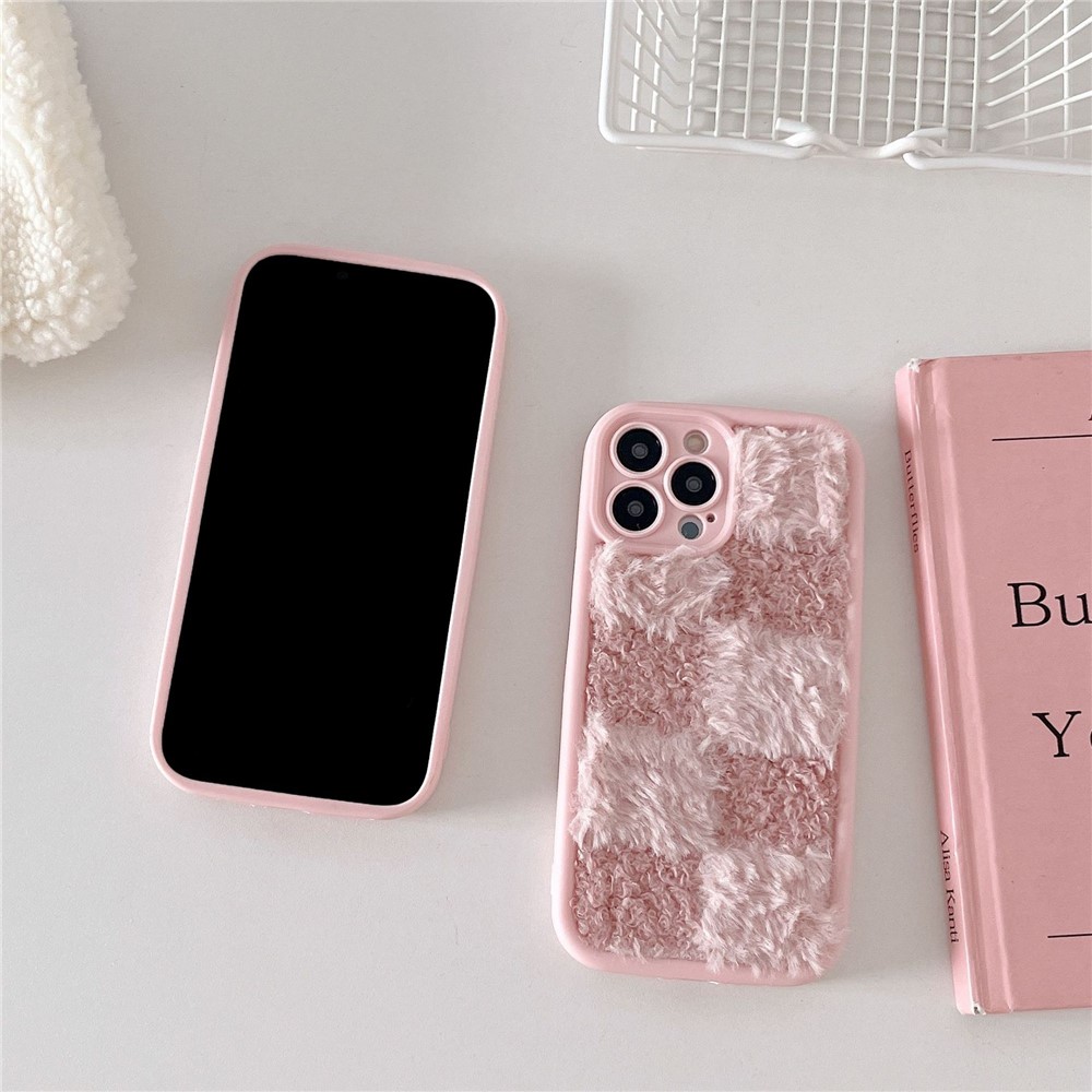 - Plush Patchwork Grid Design Combines a soft, plush texture with a chic grid-patterned TPU panel for a cozy yet stylish aesthetic