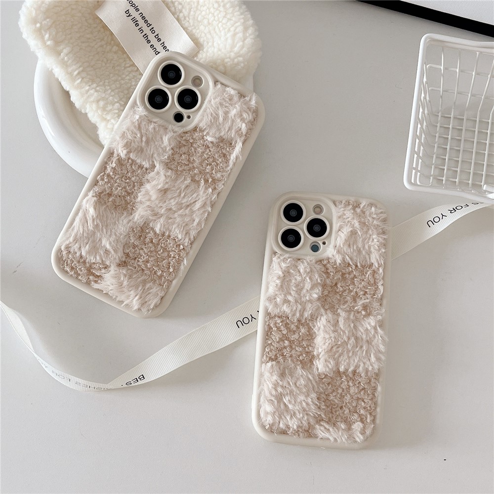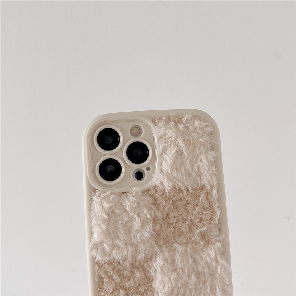 - Plush Patchwork Grid Design Combines a soft, plush texture with a chic grid-patterned TPU panel for a cozy yet stylish aesthetic