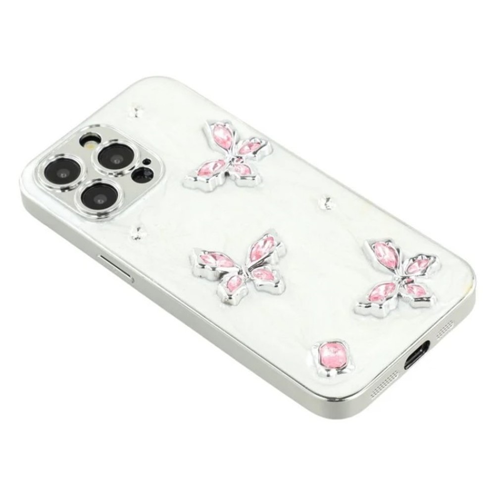 For iPhone 15 Pro Max Case WANLONFENG Electroplated Epoxy TPU + Acrylic Phone Cover with Tempered Glass – Pink Butterfly