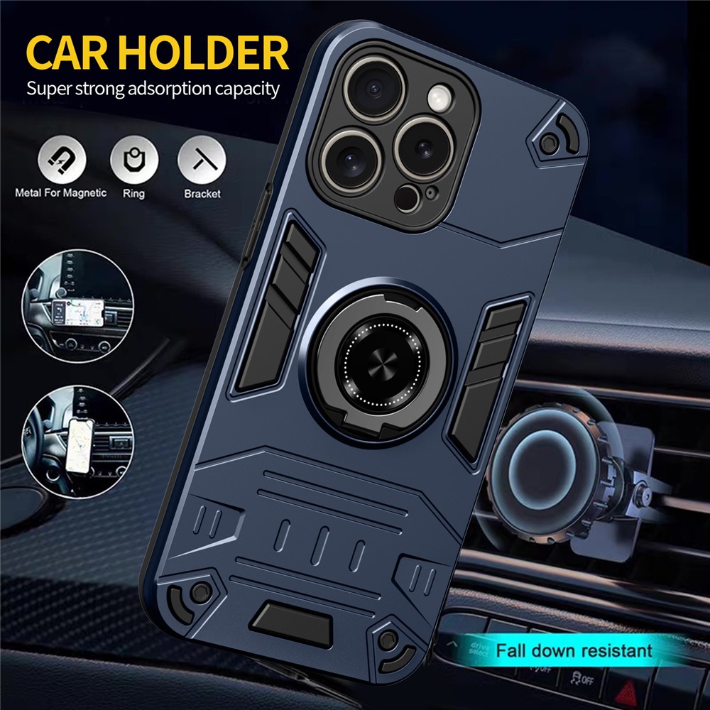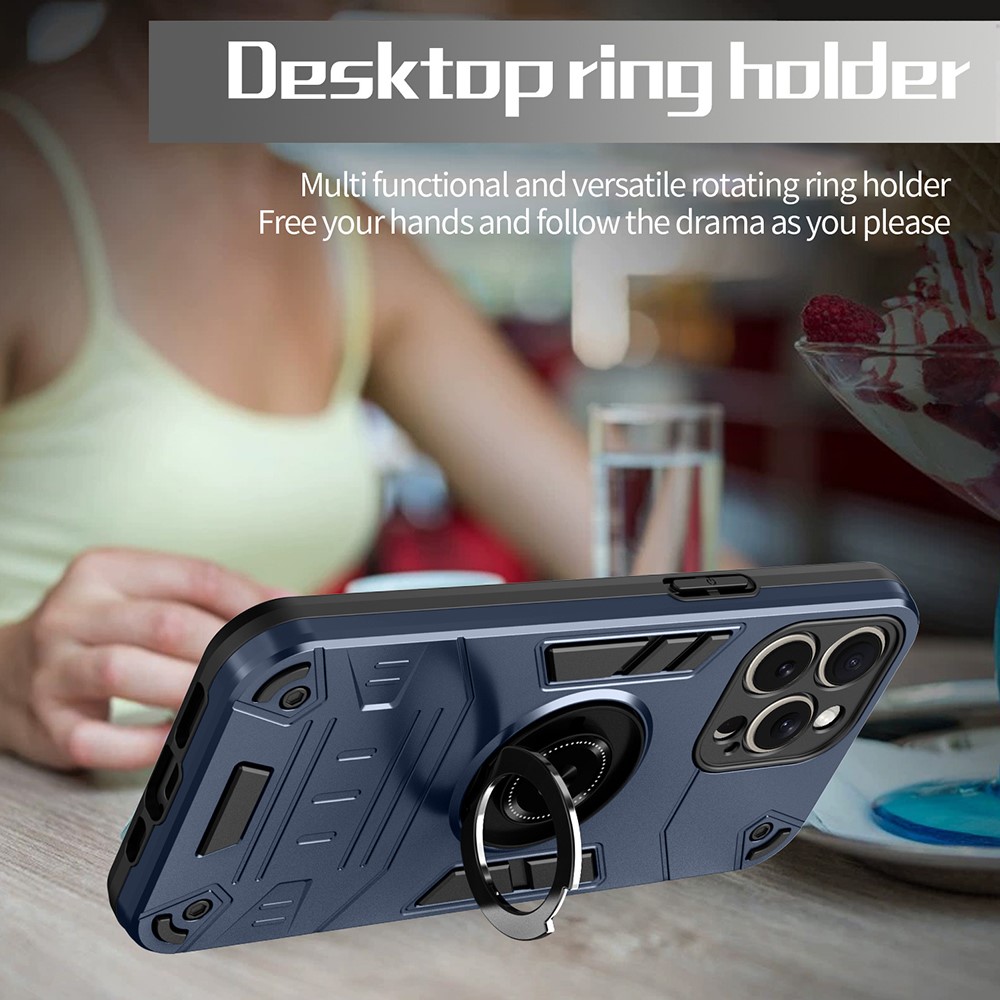 For iPhone 15 Pro Max Case with Ring Holder Kickstand PC + TPU Anti-Fall Phone Cover – Dark Blue