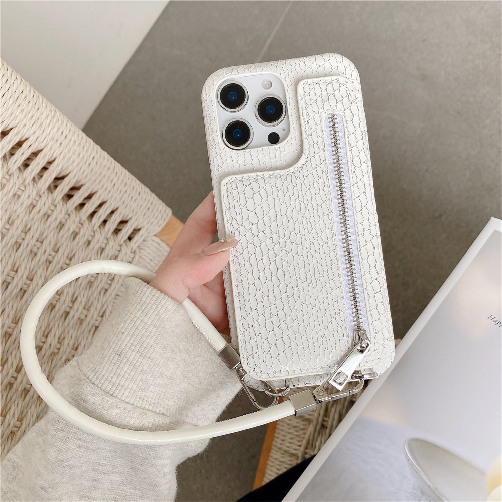For iPhone 15 Pro Max Case Zipper Card Holder Mirror Snake Texture PU + PC Back Cover with Lanyard – White