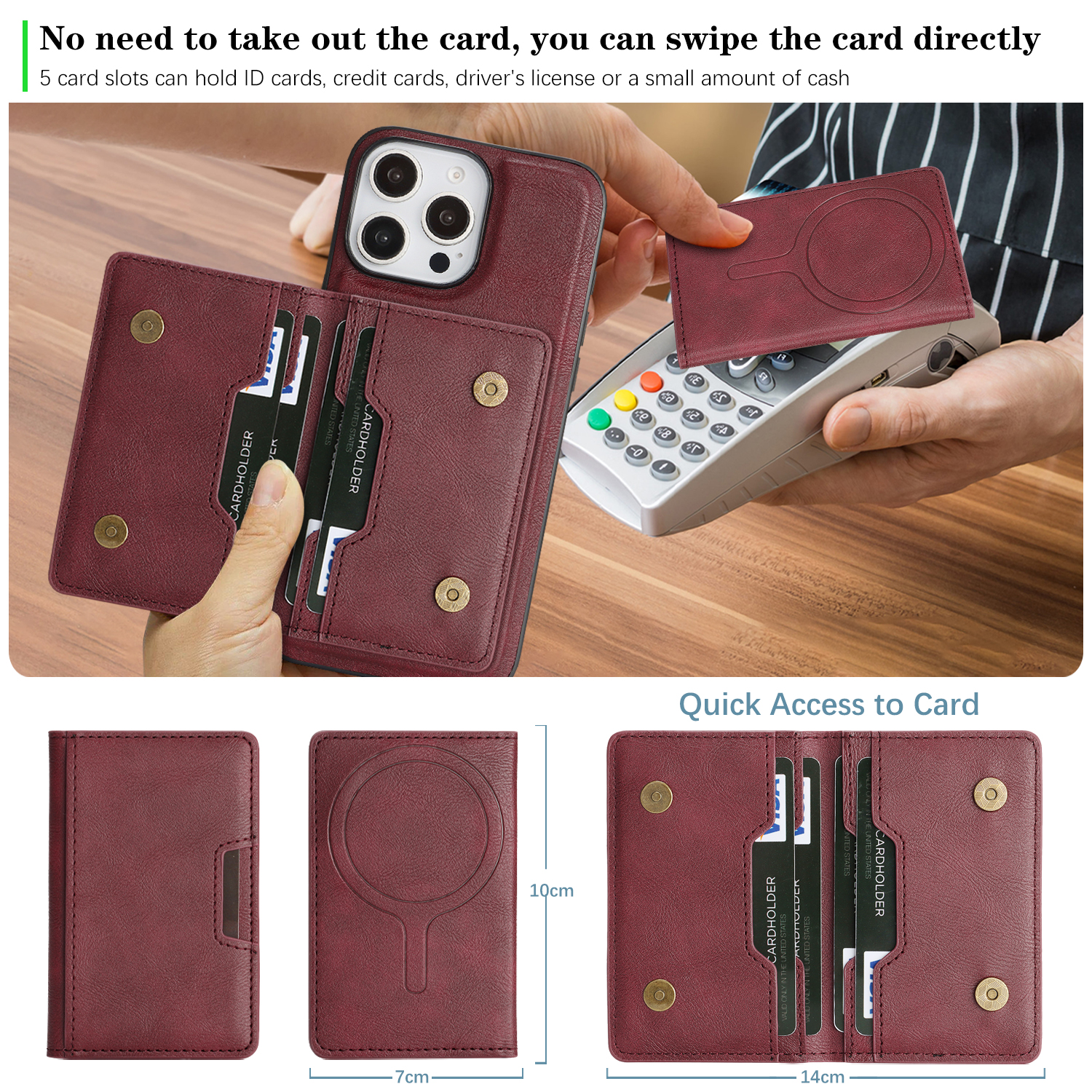 - MagSafe Compatible Supports for MagSafe accessories and wireless charging, featuring a minimalist magnetic leather bi-fold design with card holder functionality.