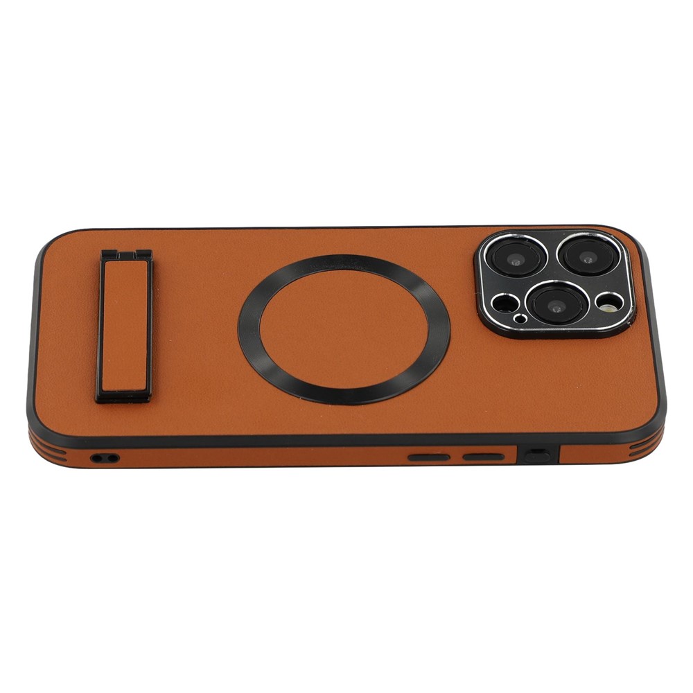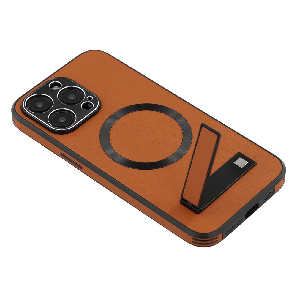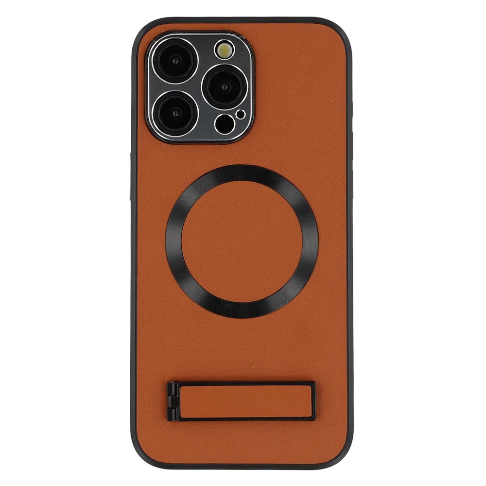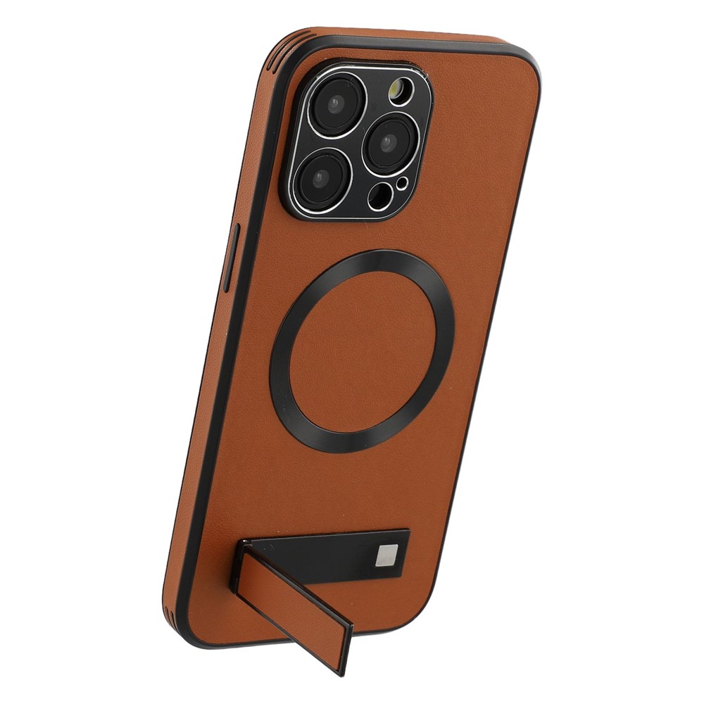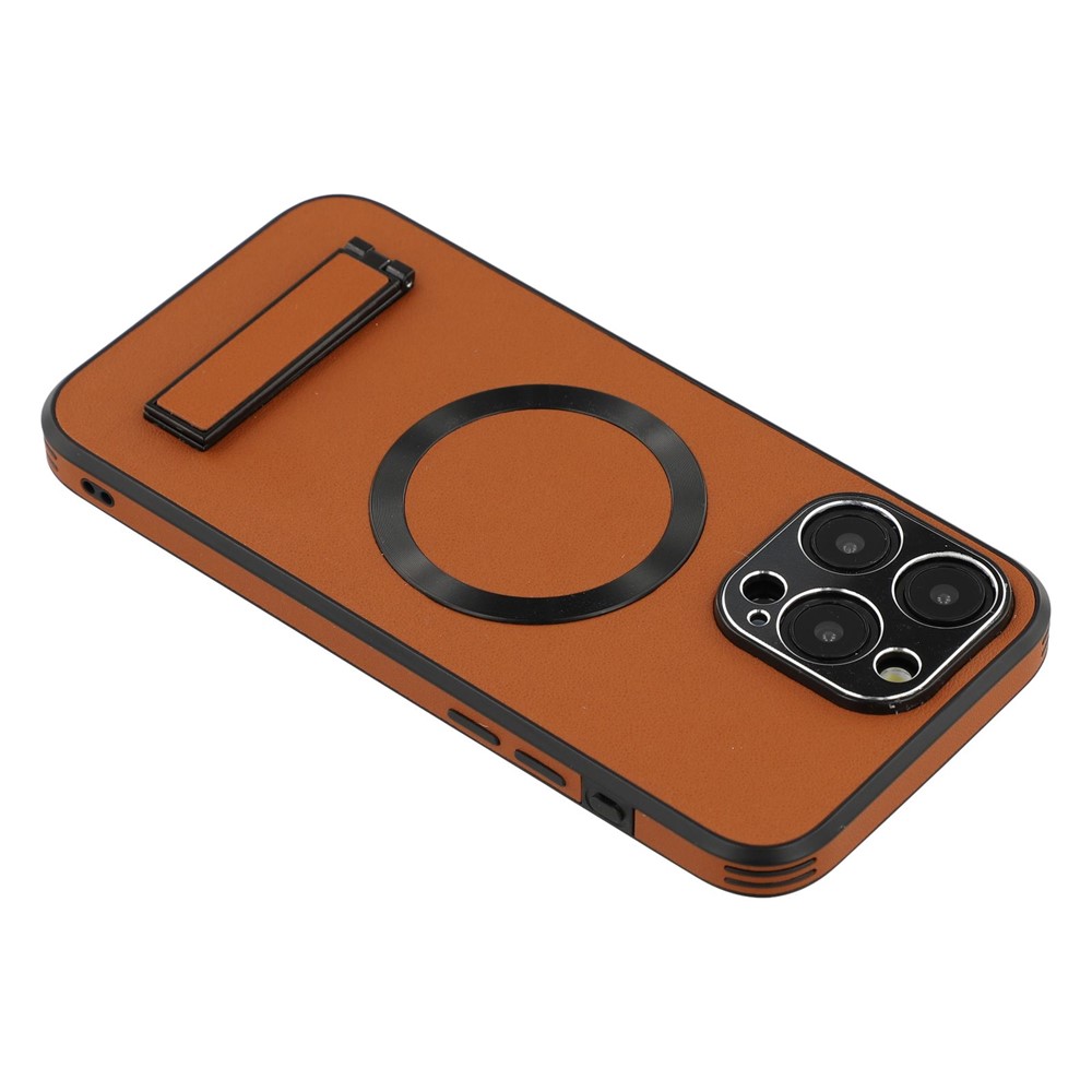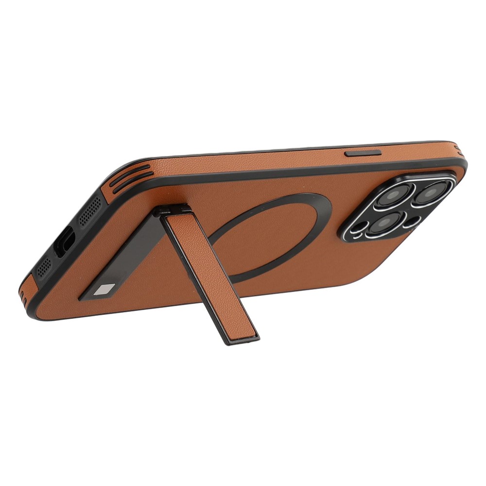 For iPhone 15 Pro Max Kickstand Case Compatible with MagSafe PC + TPU + PU Phone Back Cover - Brown