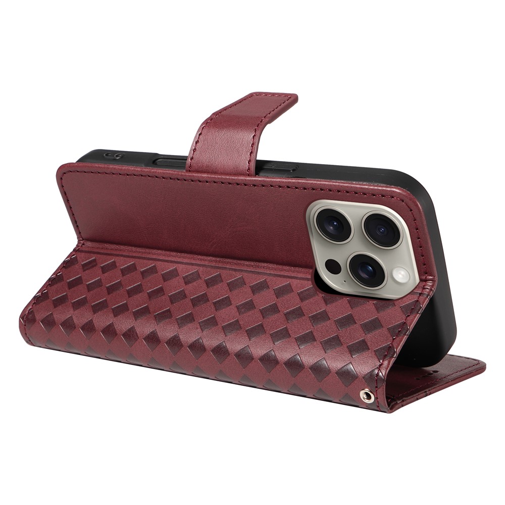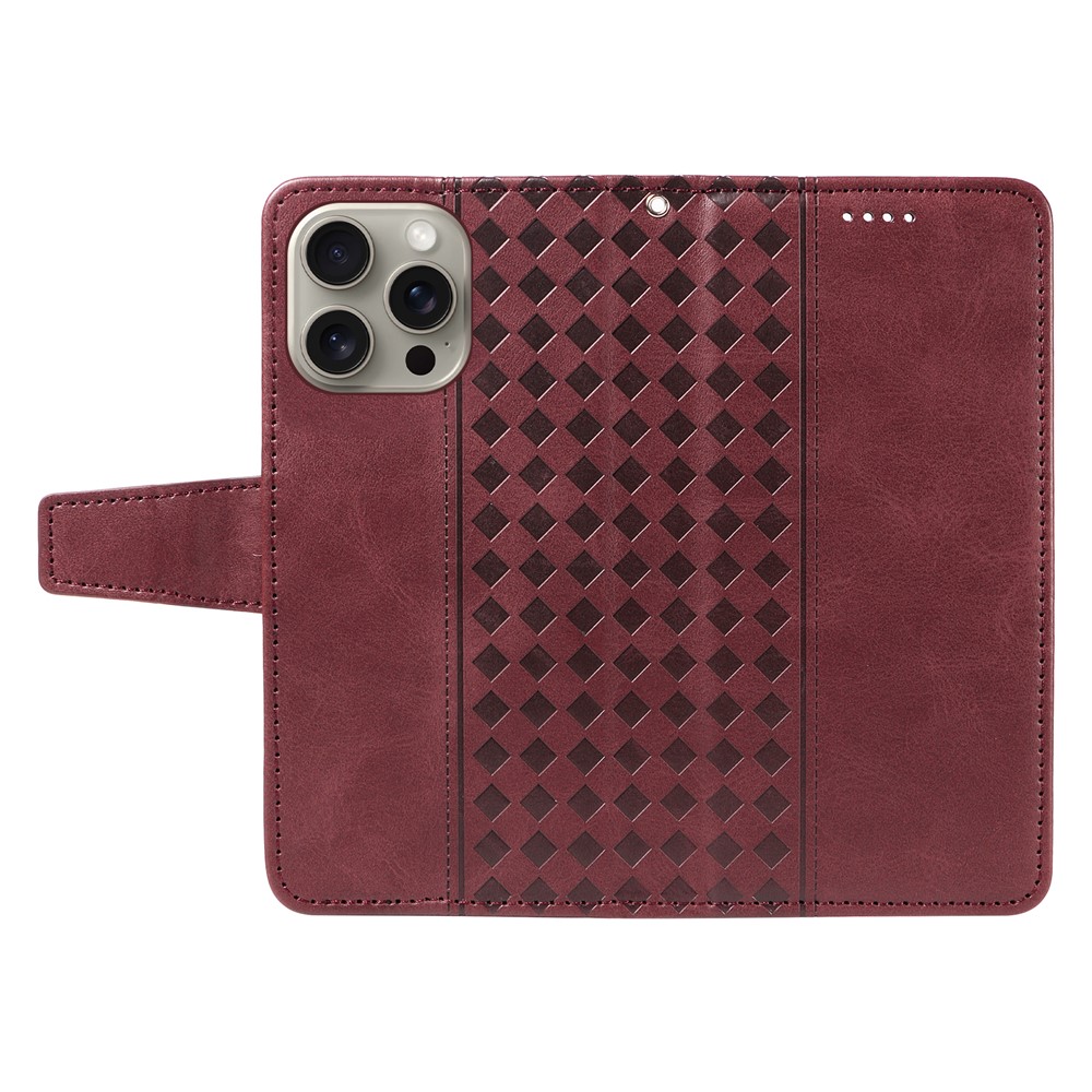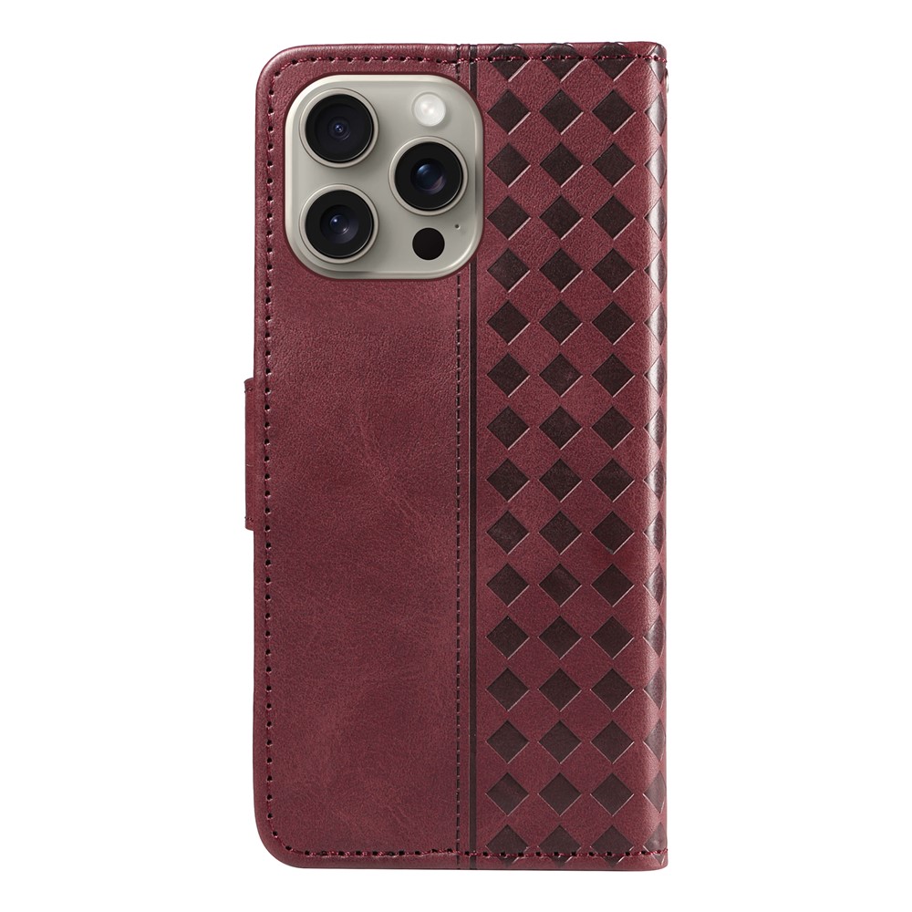For iPhone 15 Pro Max Leather Case Wallet Stand Grids Imprinted Phone Cover with Strap -  Wine Red