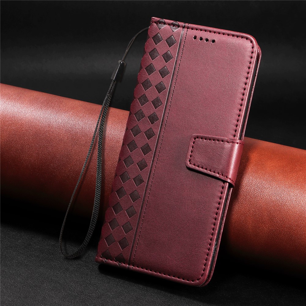 For iPhone 15 Pro Max Leather Case Wallet Stand Grids Imprinted Phone Cover with Strap - Wine Red $15.71
