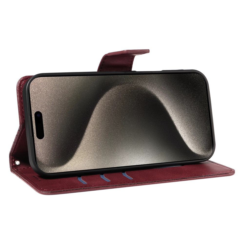 For iPhone 15 Pro Max Leather Case Wallet Stand Grids Imprinted Phone Cover with Strap – Wine Red