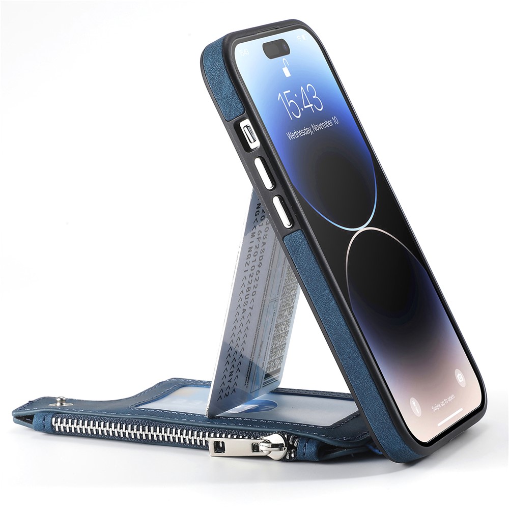 For iPhone 15 Pro Max Magnetic Case Card Holder Kickstand TPU + Leather Back Cover – Blue
