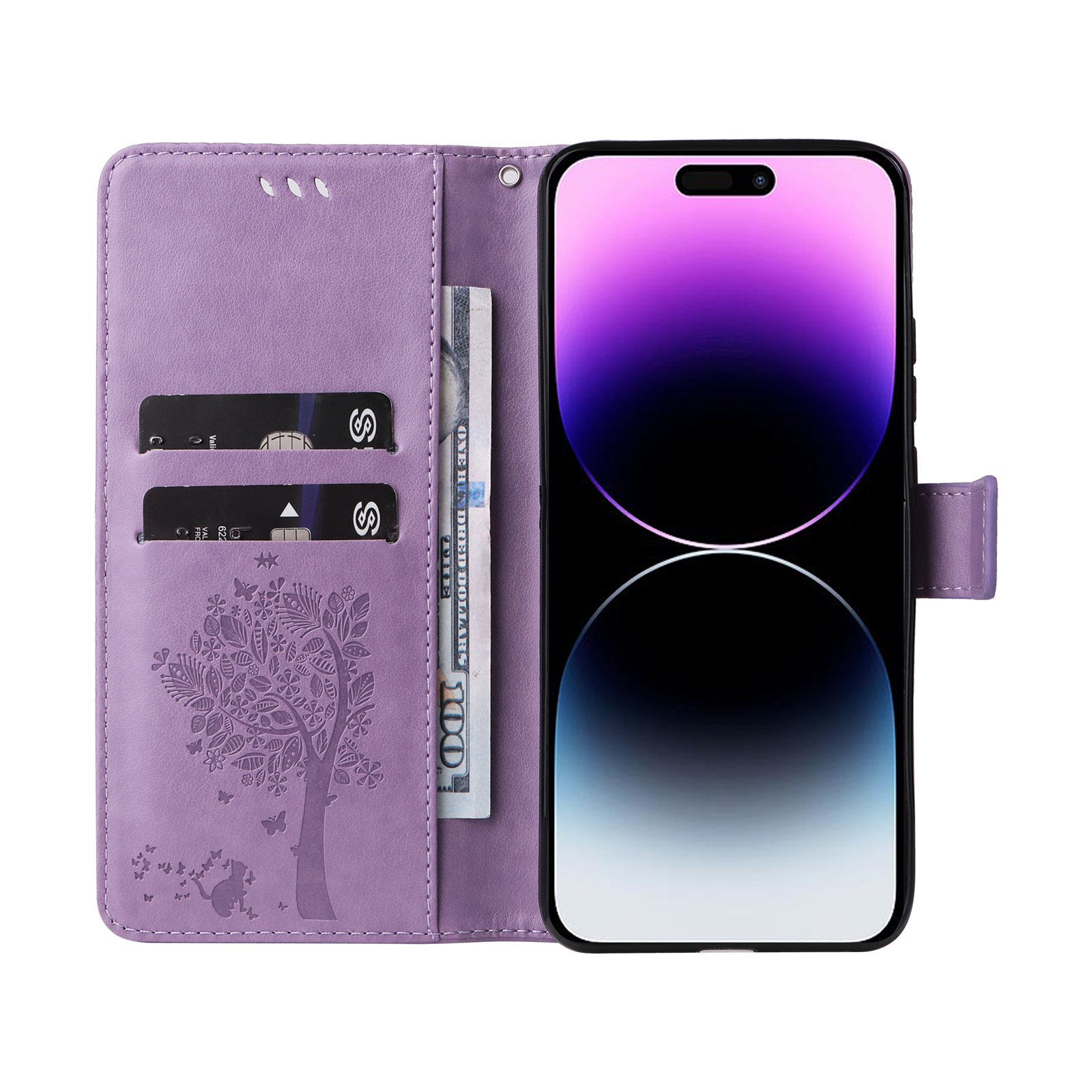 - Elegant Pattern Imprinted Features a stunning cat and tree pattern imprinted design on the front cover and the inner card slots area, adding a touch of luxury and uniqueness
