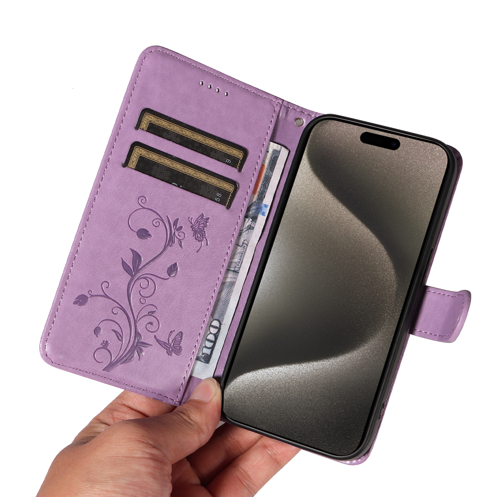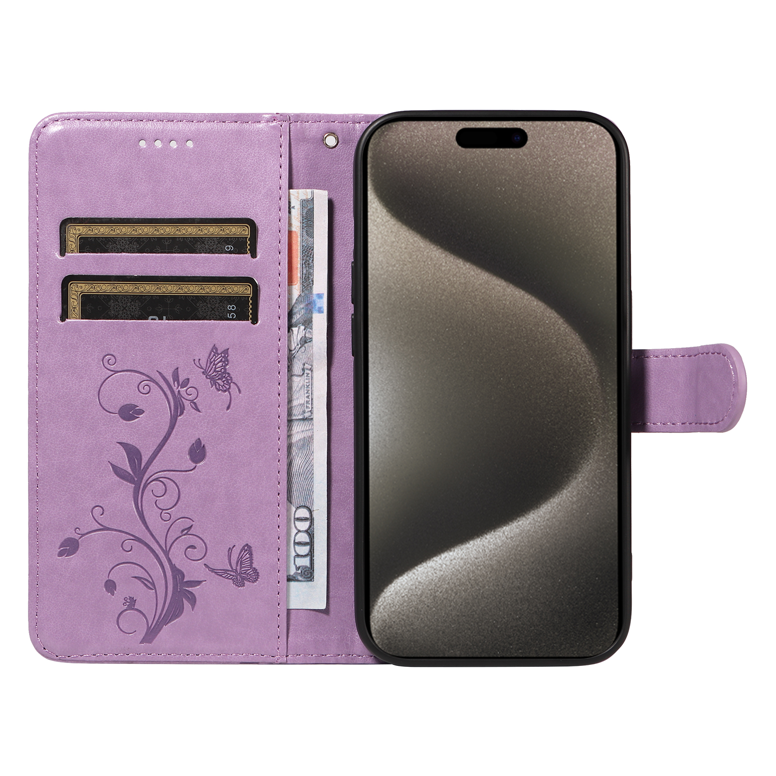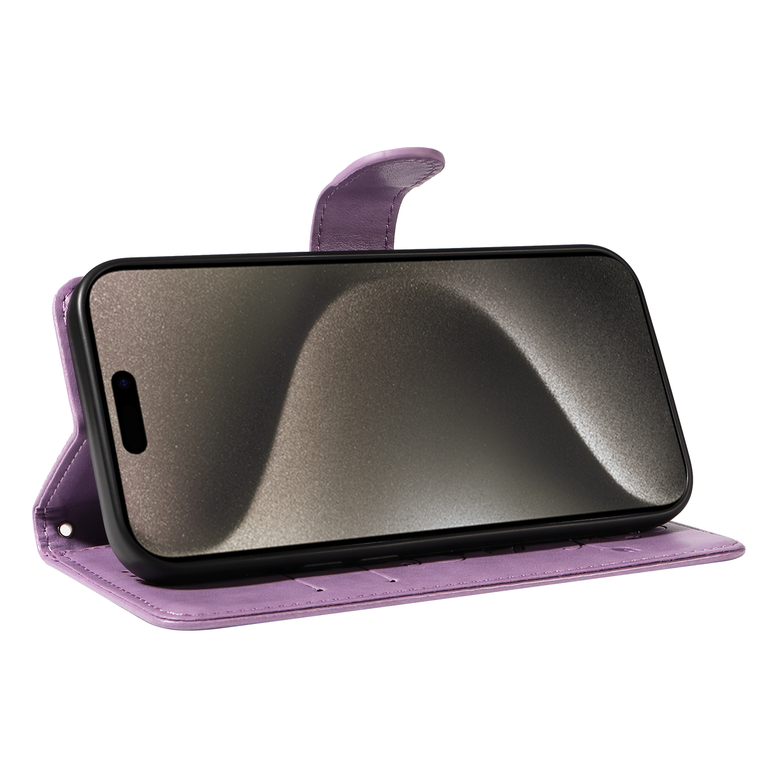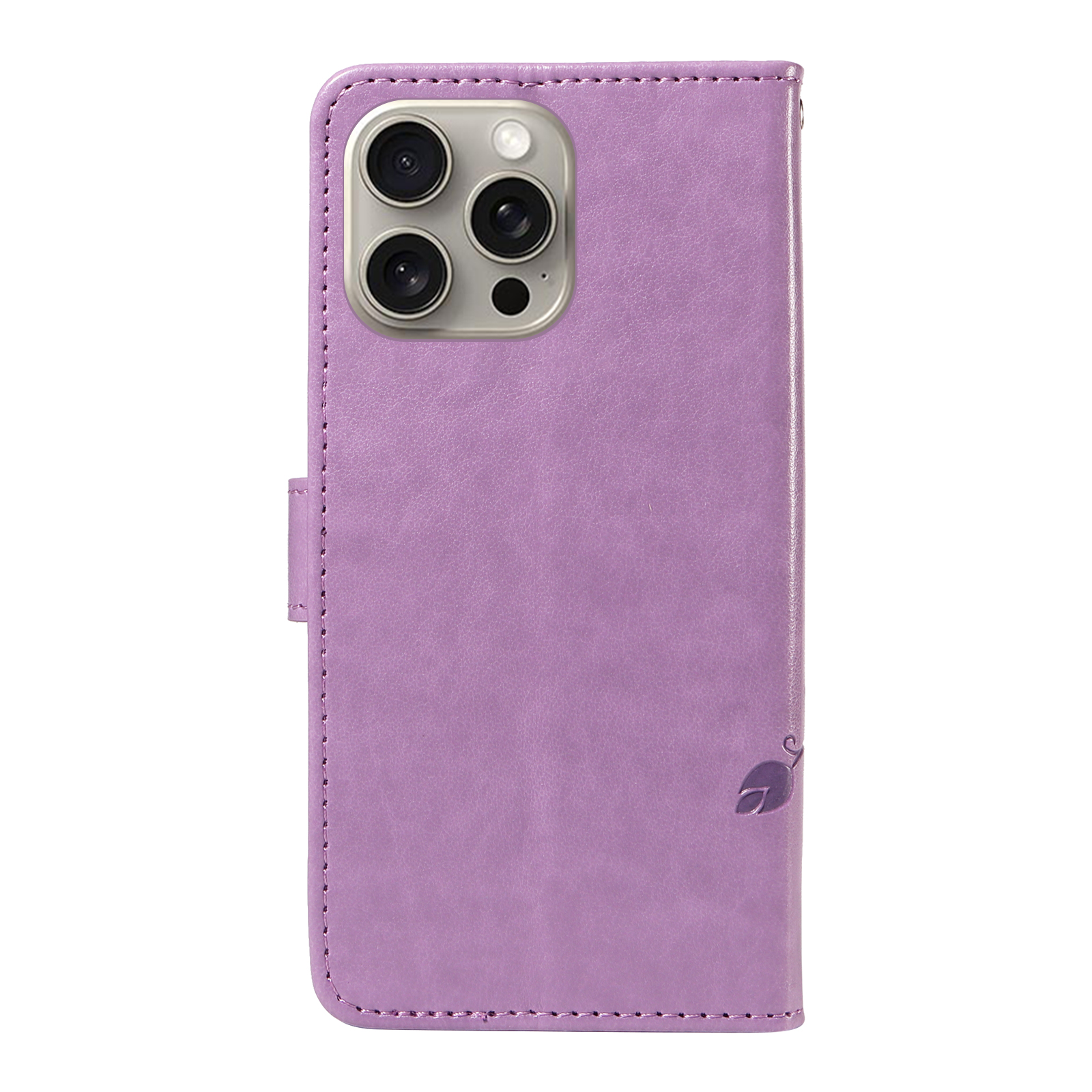 For iPhone 15 Pro Max PU Leather Cases Flower Pattern Wallet Stand Phone Cover with Strap – Light Purple