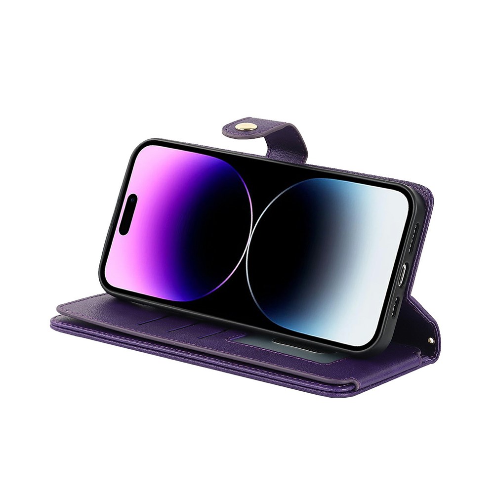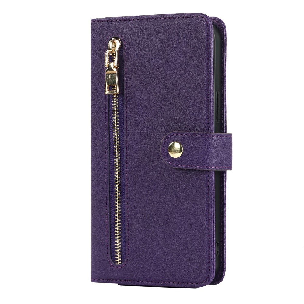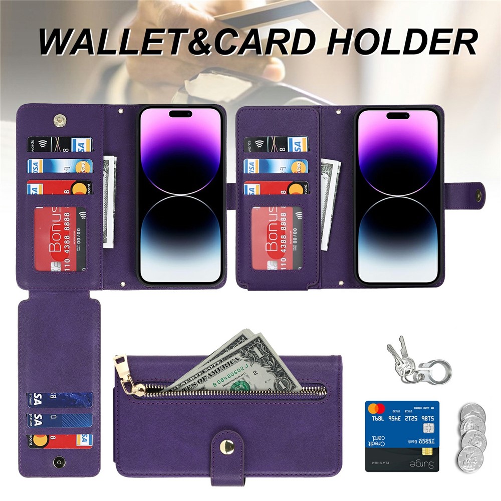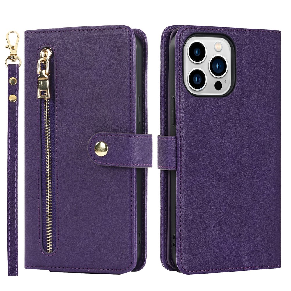 For iPhone 15 Pro Max Stand Case PU Leather Phone Cover with Straps / Zipper Wallet / Multiple Card Slots – Purple