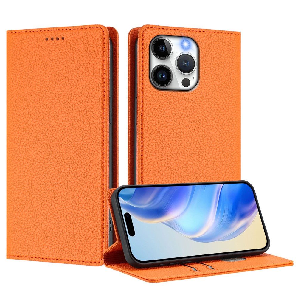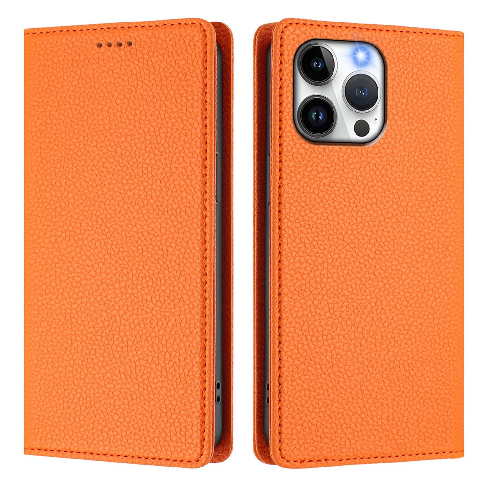 For iPhone 15 Pro Max Wallet Case RFID Blocking Litchi Texture Leather Mobile Cover – Orange