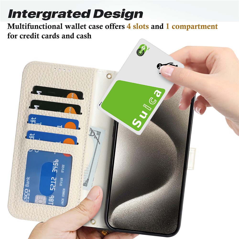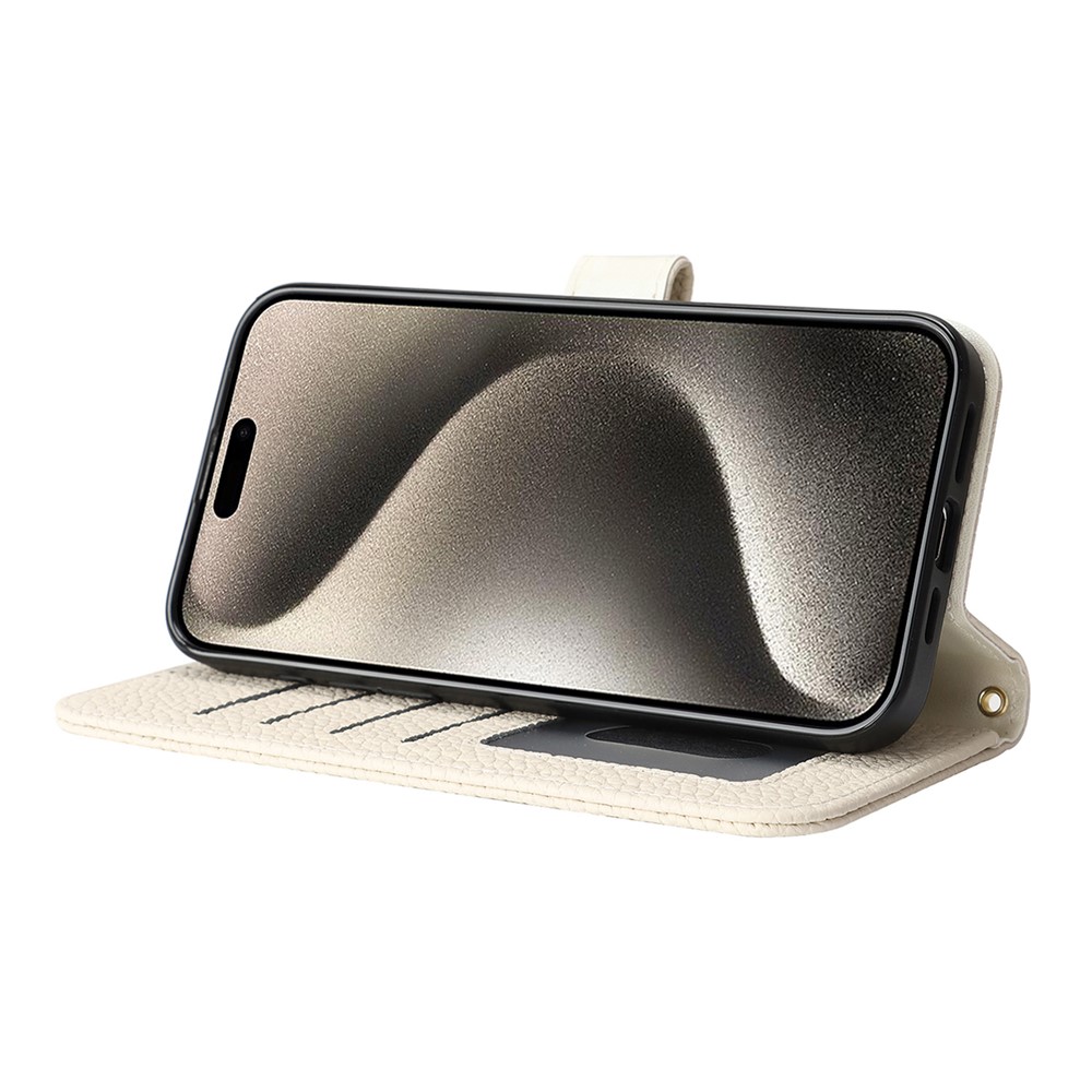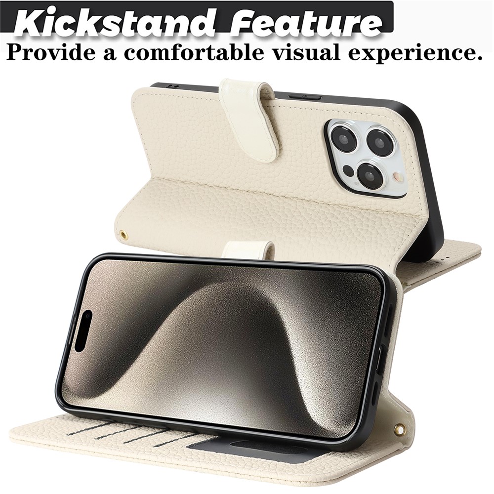For iPhone 15 Pro Stand Case Litchi Texture Genuine Cow Leather Wallet Phone Cover RFID Blocking – White