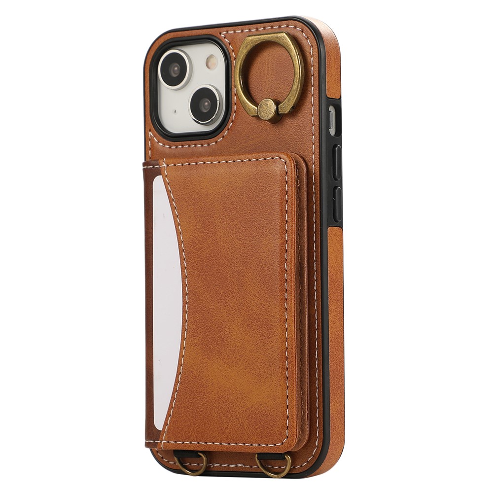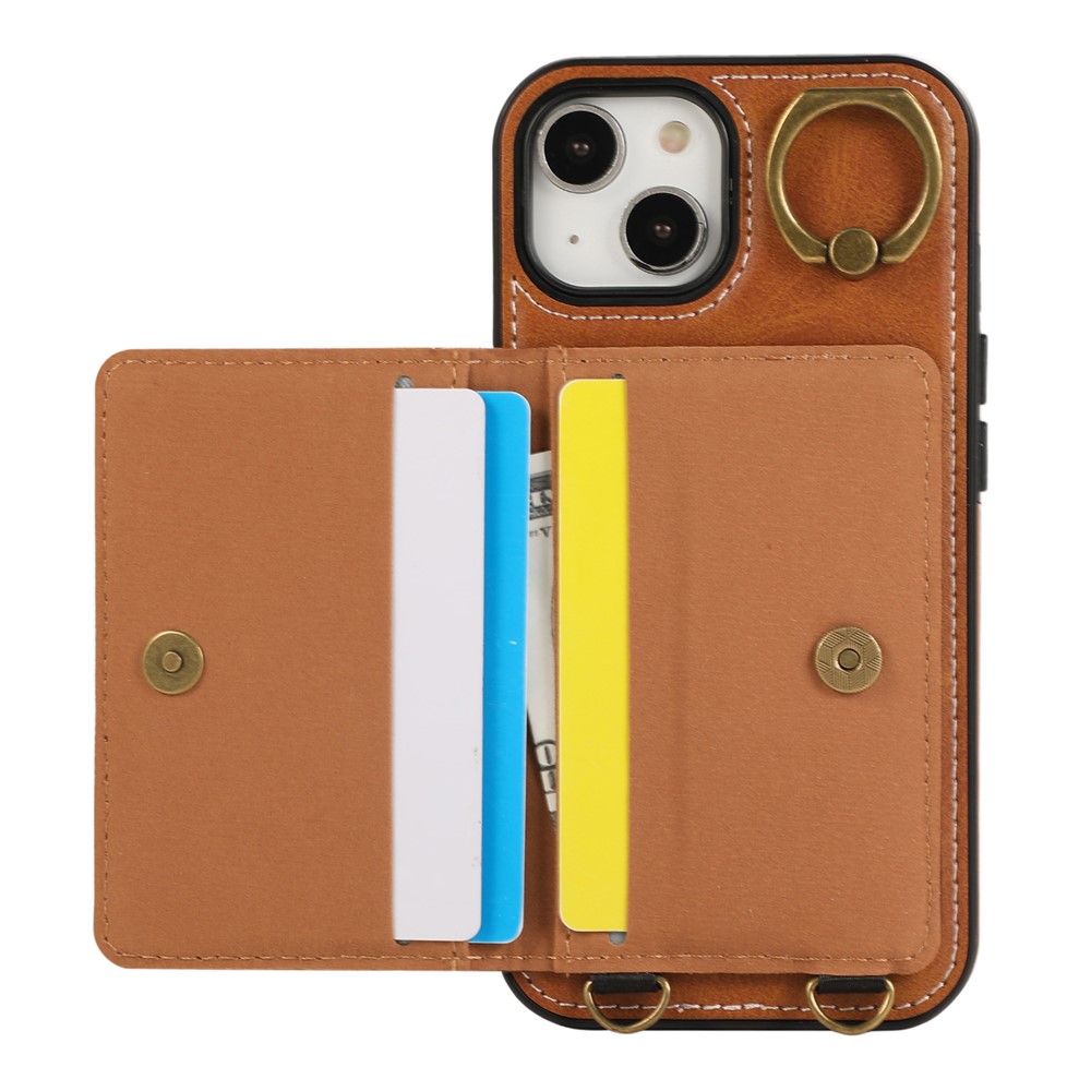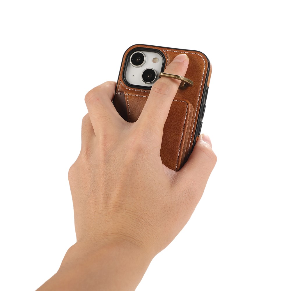 For iPhone 15 PU Leather Back Case Card Holder Kickstand Phone Cover with Wrist Strap – Brown