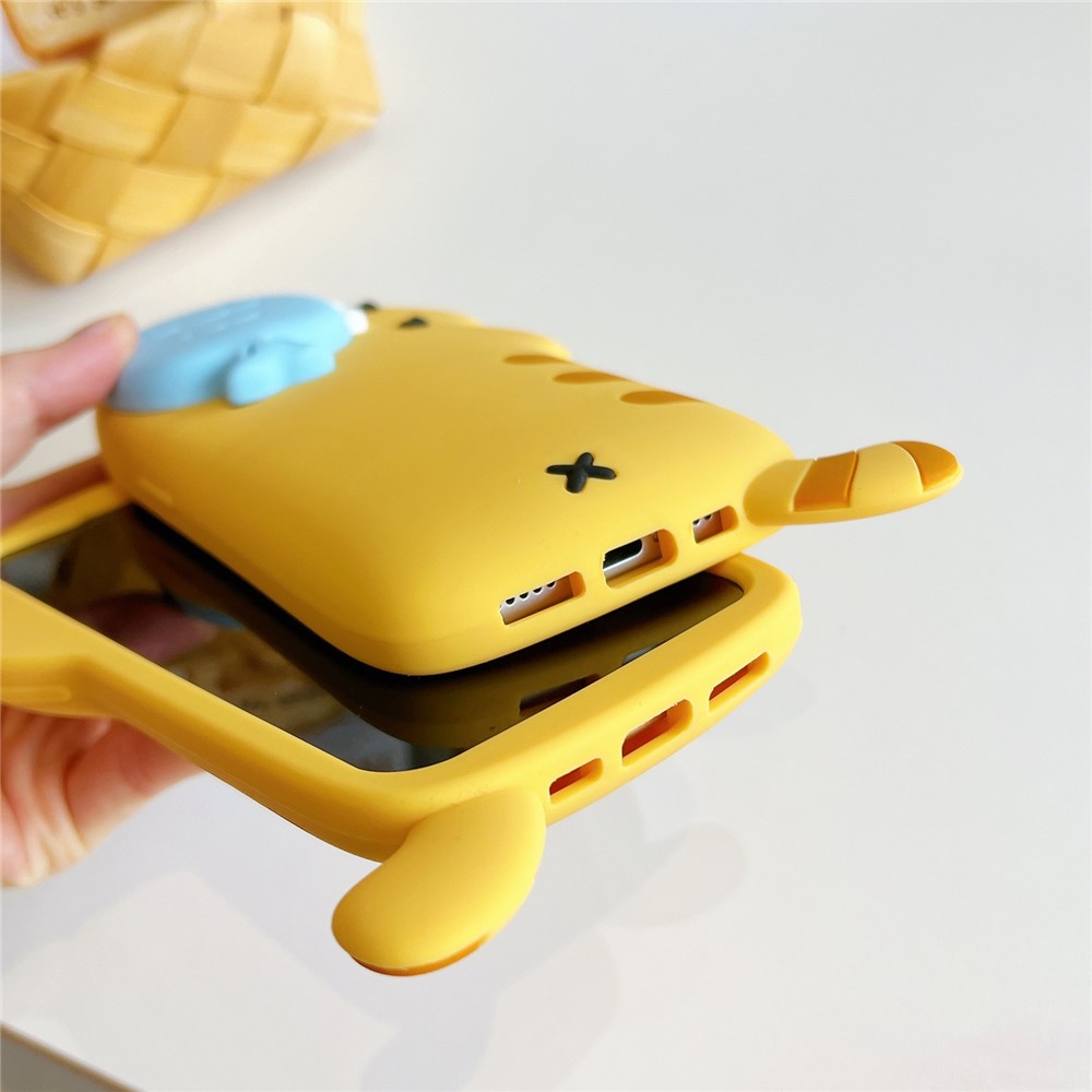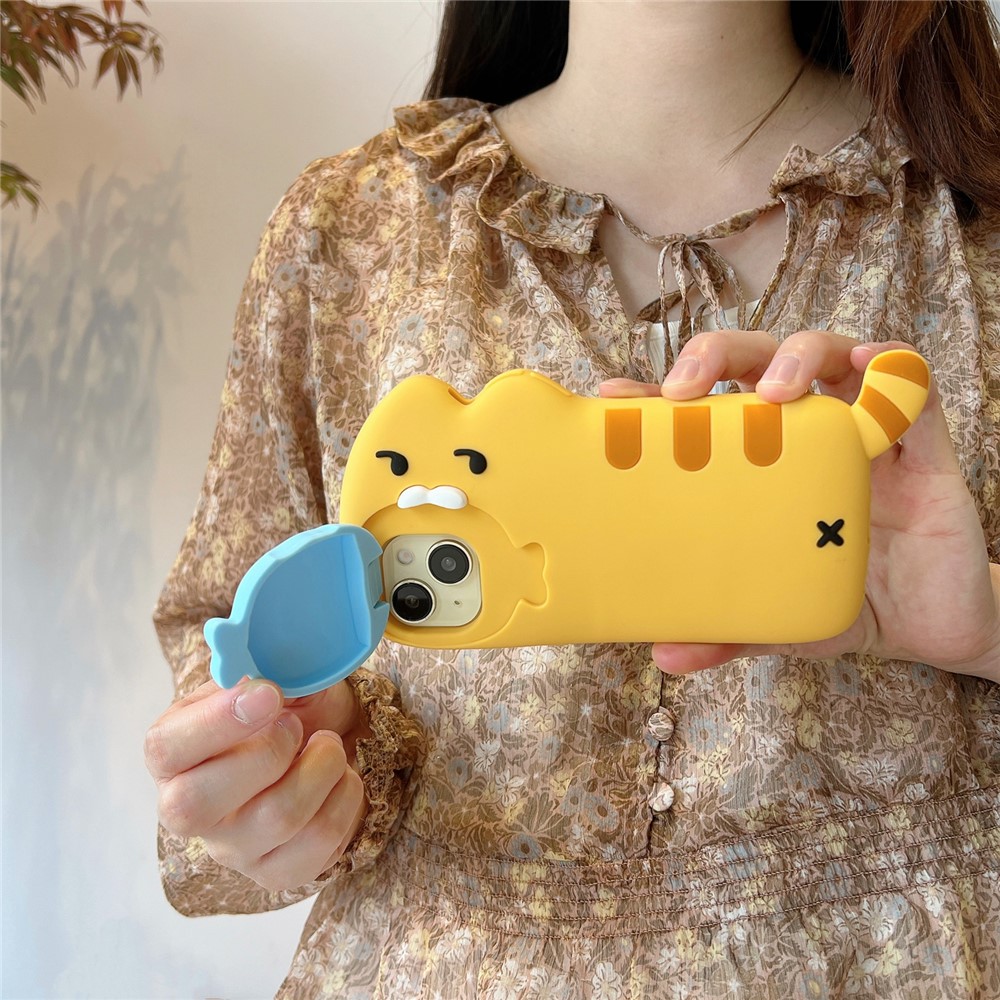 For iPhone 15 Silicone Case Cat Eating Fish Design Lens Cover Kickstand Phone Back Cover
