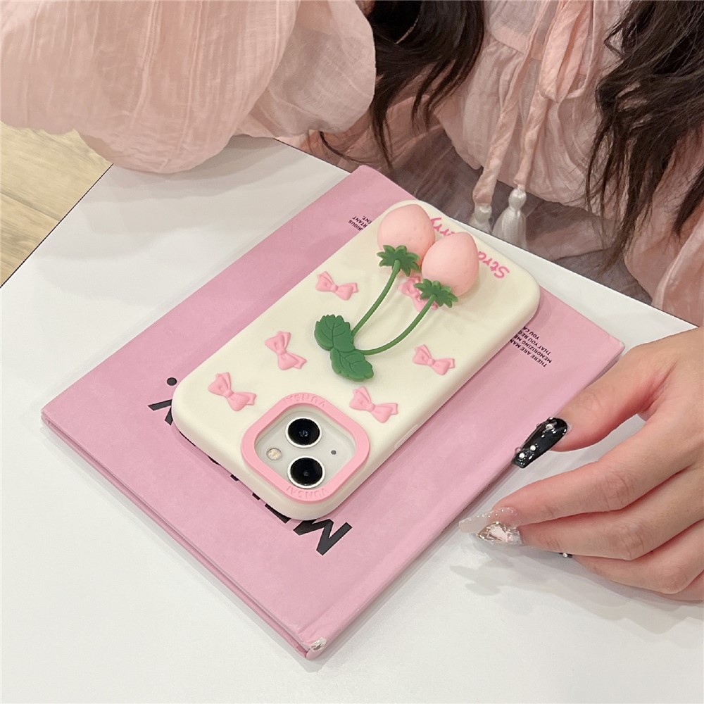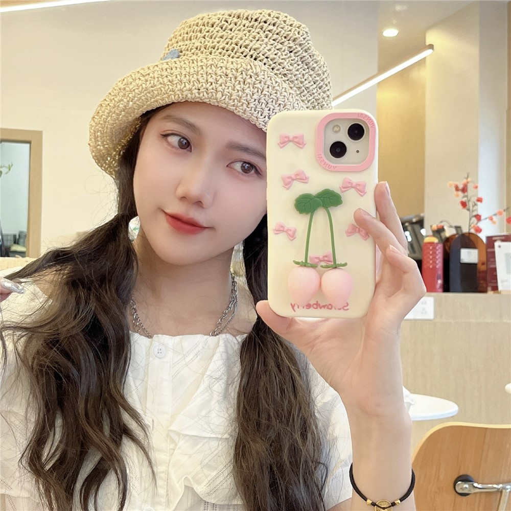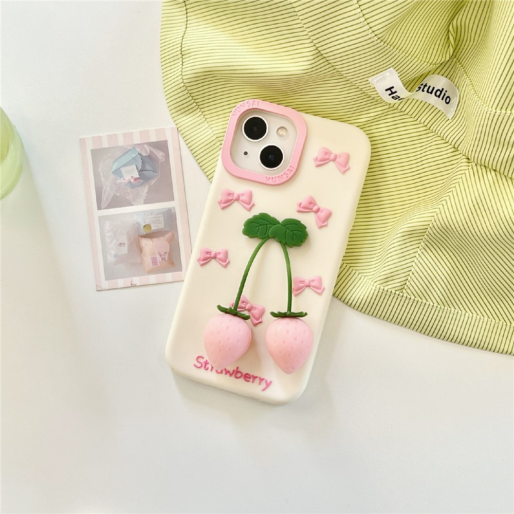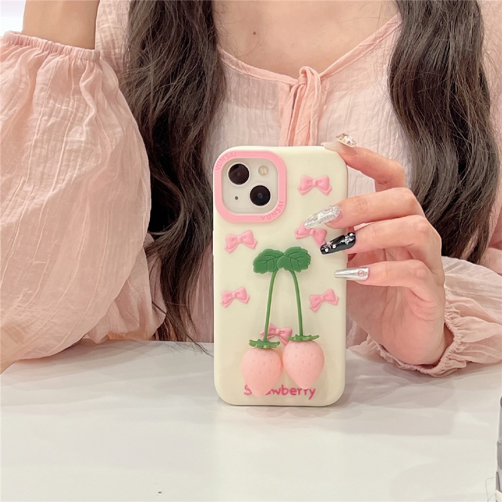 For iPhone 15 Silicone Case Cute Pendant Strawberry Design Shockproof Durable Phone Cover