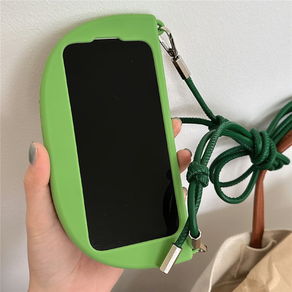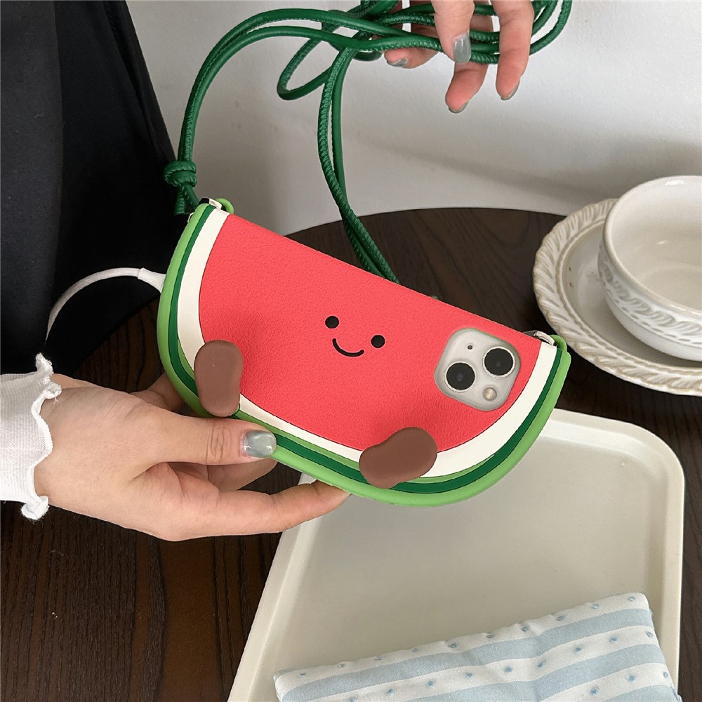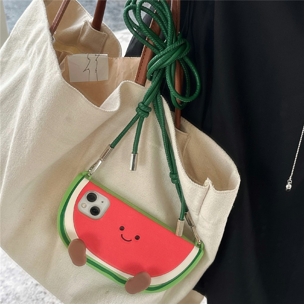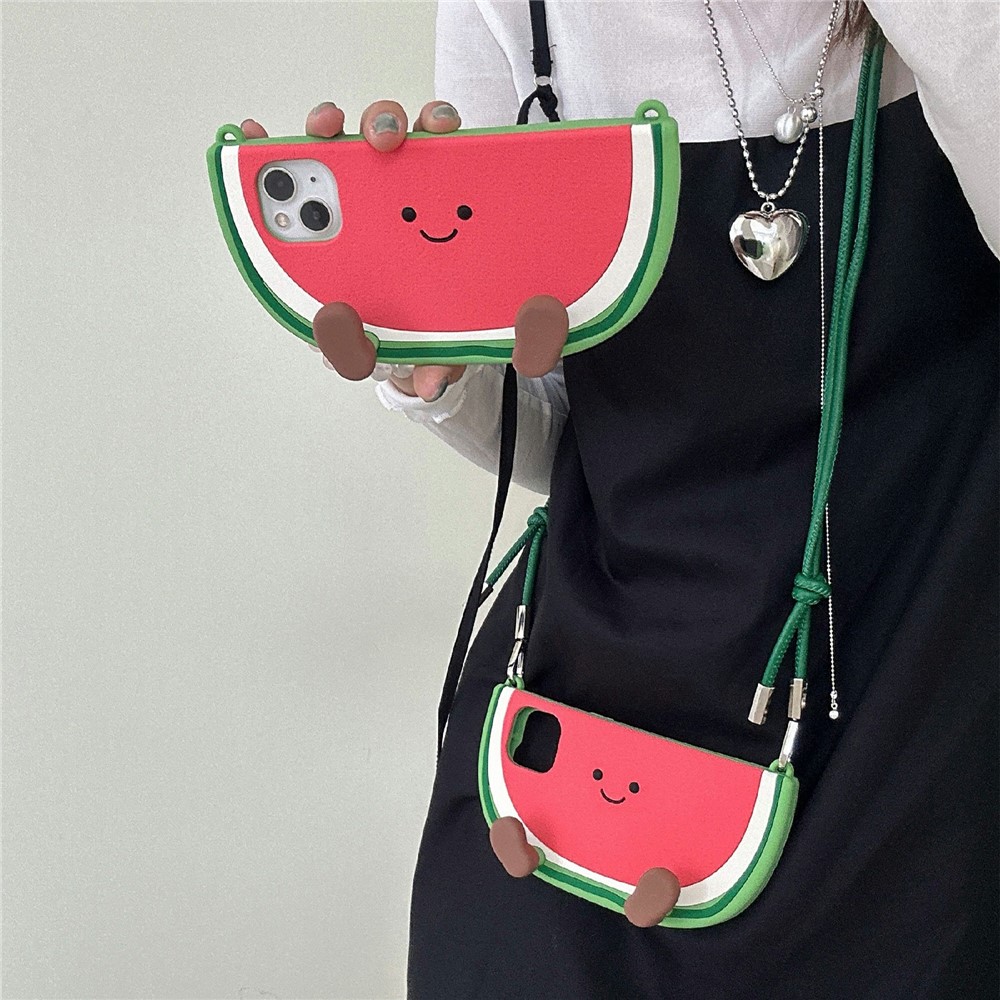 For iPhone 15 Silicone Case Standing Watermelon Design Kickstand Shockproof Phone Cover with Shoulder Strap